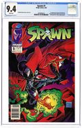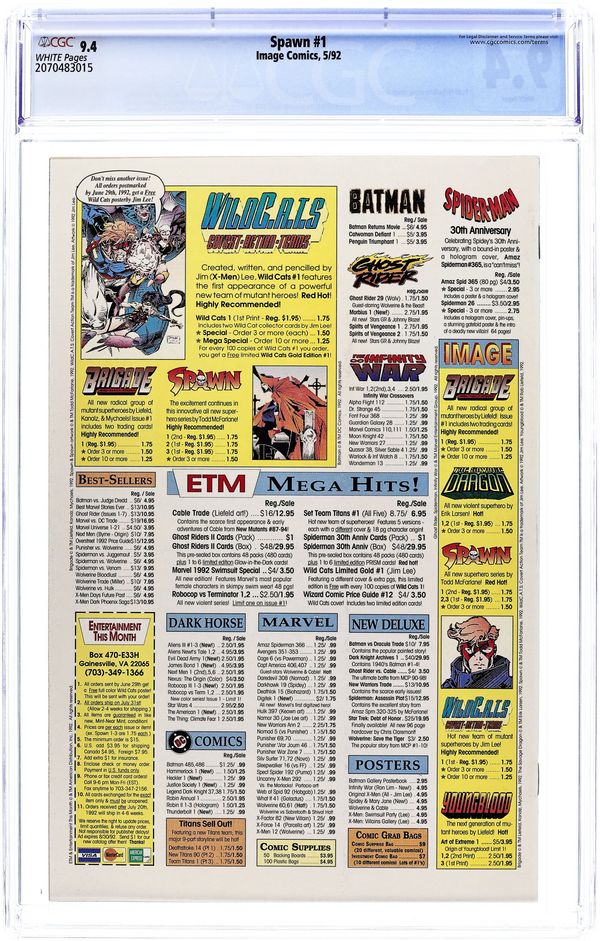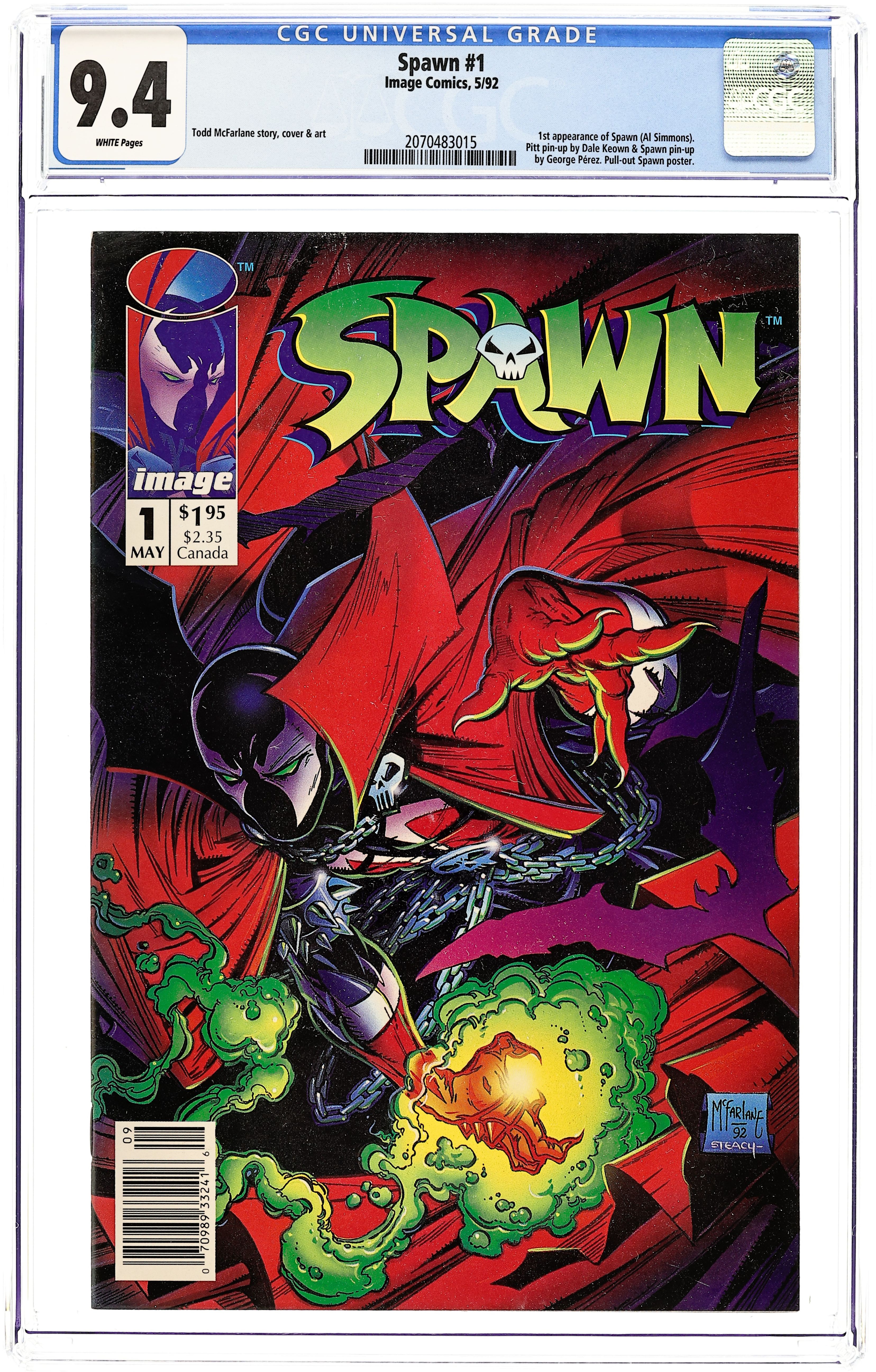 Newsstand edition. "Questions!" Part 1 of 4. Created, story, and art by Todd McFarlane. When government assassin Al Simmons is murdered, a deal with the devil brings him back to the realm of the living. But now he walks the shadows as the disfigured soldier of hell known as Spawn. Armed with unimaginable, but finite, magical abilities, Spawn is destined to play an important role in the upcoming Armageddon. But, what happens when this rebellious anti-hero decides he won't fight for either side? Superstar artist and Image co-founder, Todd McFarlane, creates a character who has gone on to inspire a major motion picture, an HBO animated series, numerous spin-off comic series, and one of the most successful toylines of all time. Spawn centerfold by Todd McFarlane & Ken Steacy. Pin-up of Spawn by George Perez. Pin-up of PITT by Dale Keown. Cover by McFarlane & Steacy. 1st app of Sam and Twitch Cover price $1.95.