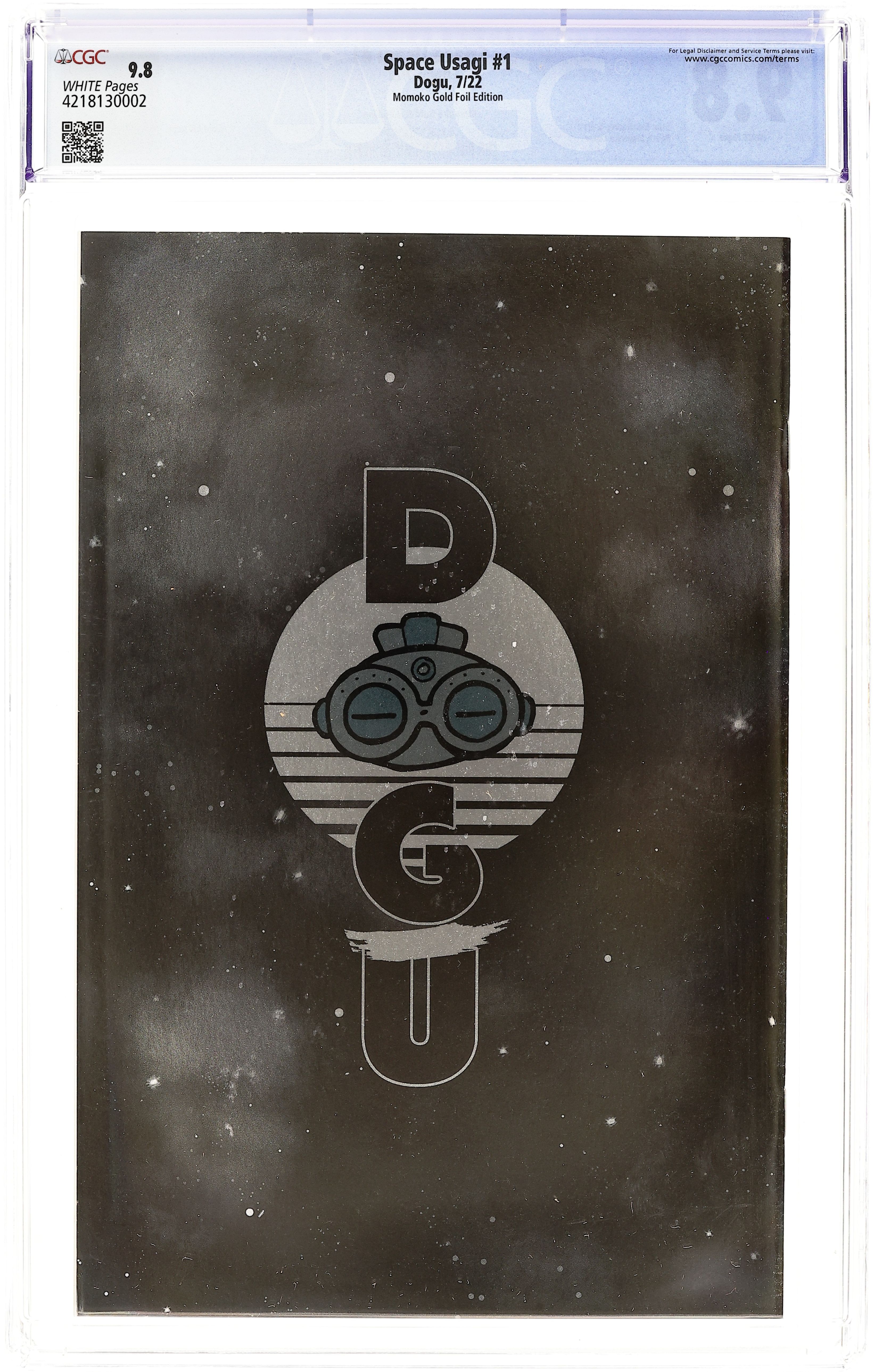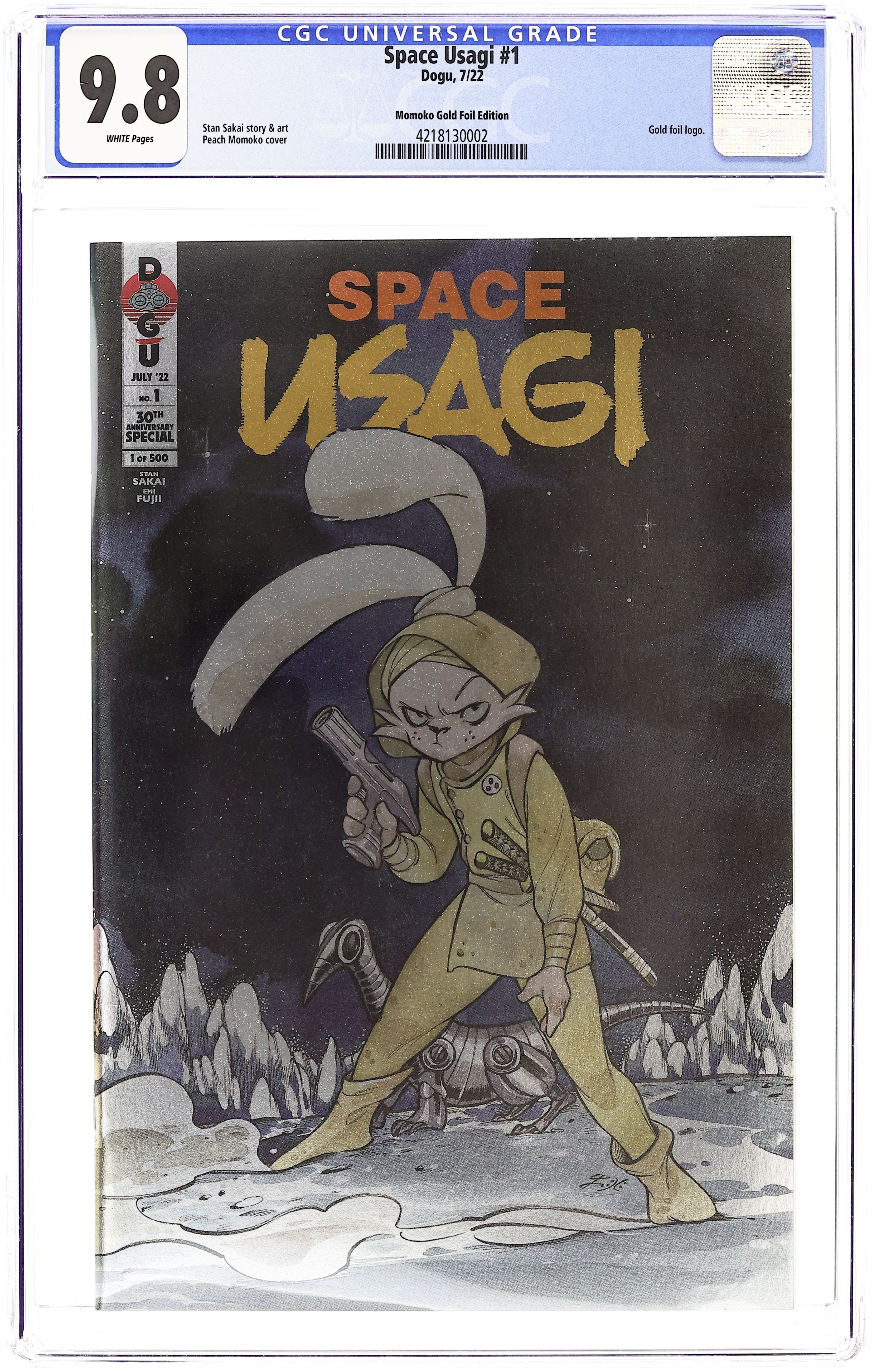 Convention Exclusive Purple Spot Foil Cover by Peach Momoko. Written by Stan Sakai. Art by Stan Sakai. Fans of legendary swordsman and wanderer Usagi Yojimbo have enjoyed countless tales told of his exciting adventures—tales told over hundreds, perhaps thousands, of years. Someone in the far future enjoys another classic adventure featuring the rabbit ronin, and Stan Sakai's Space Usagi universe returns with a unique, new story. • The fan-favorite Space Usagi series returns in this special, full-color one-shot issue! 32 pages, full color.