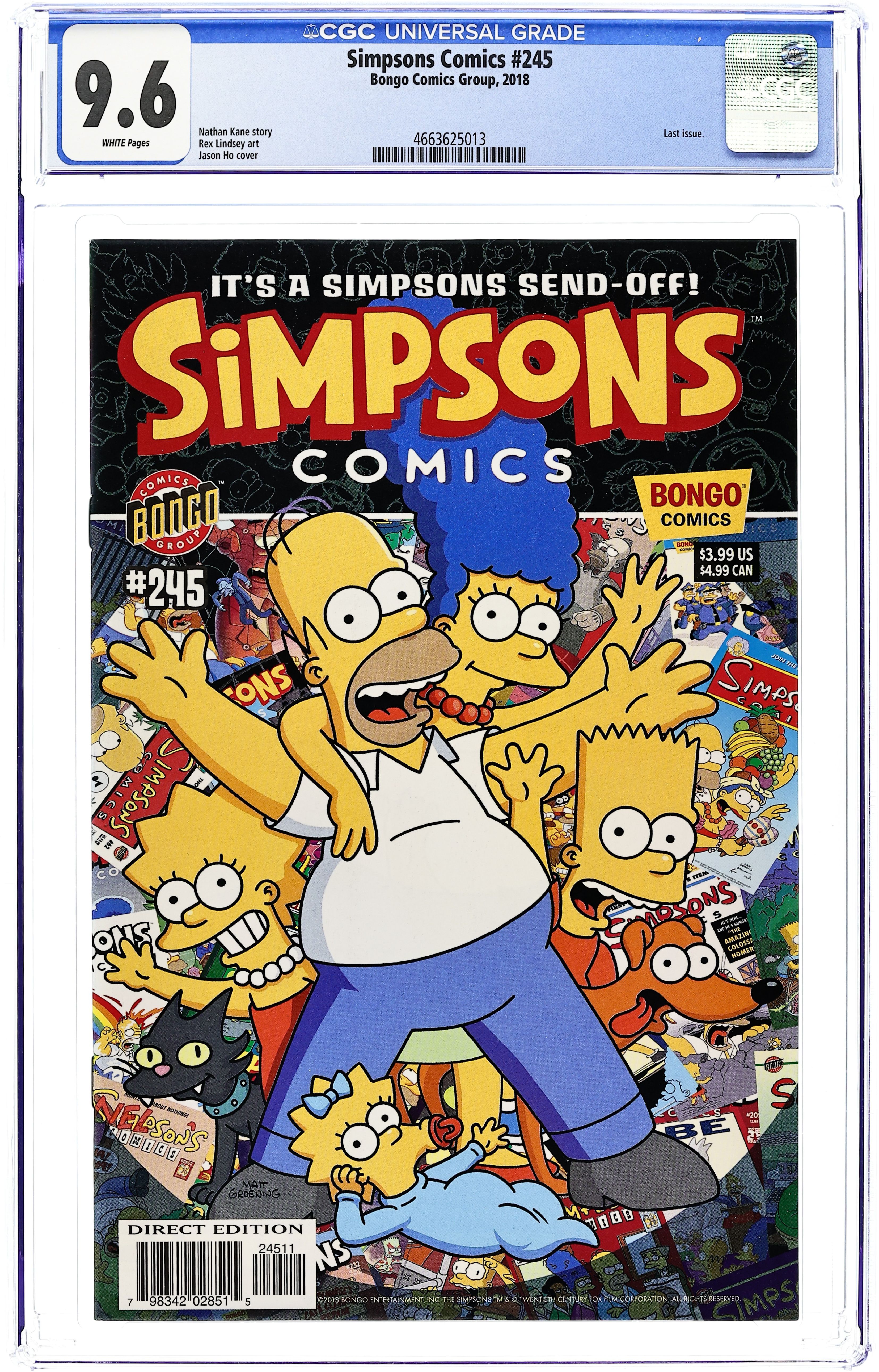 Written by Nathan Kane. Art by Rex Lindsey. Cover by Jason Ho and Nathan Kane. It's a Simpsons Comics send off! Join Bongo for the final issue of Simpsons Comics in a series finale that's been 25 years in the making! When Lisa brings home a lovable new pet from All Creatures Great and Small and Cheap, it seems like the perfect gift. But this new addition to the family turns out to be much more than anyone could have expected, and soon Springfield itself is in danger. Only one person can save the town from total disaster, but they're too busy taking a nap! It's a tale of twists, turns, irradiated missteps, and surprise cameos that will have your head spinning, bosom heaving, and wallet screaming to be emptied! A heartfelt series farewell from your pals at Bongo. We hate to say goodbye, so let's just leave it at 'Smell ya later!' 28 pages, full color. Cover price $3.99.