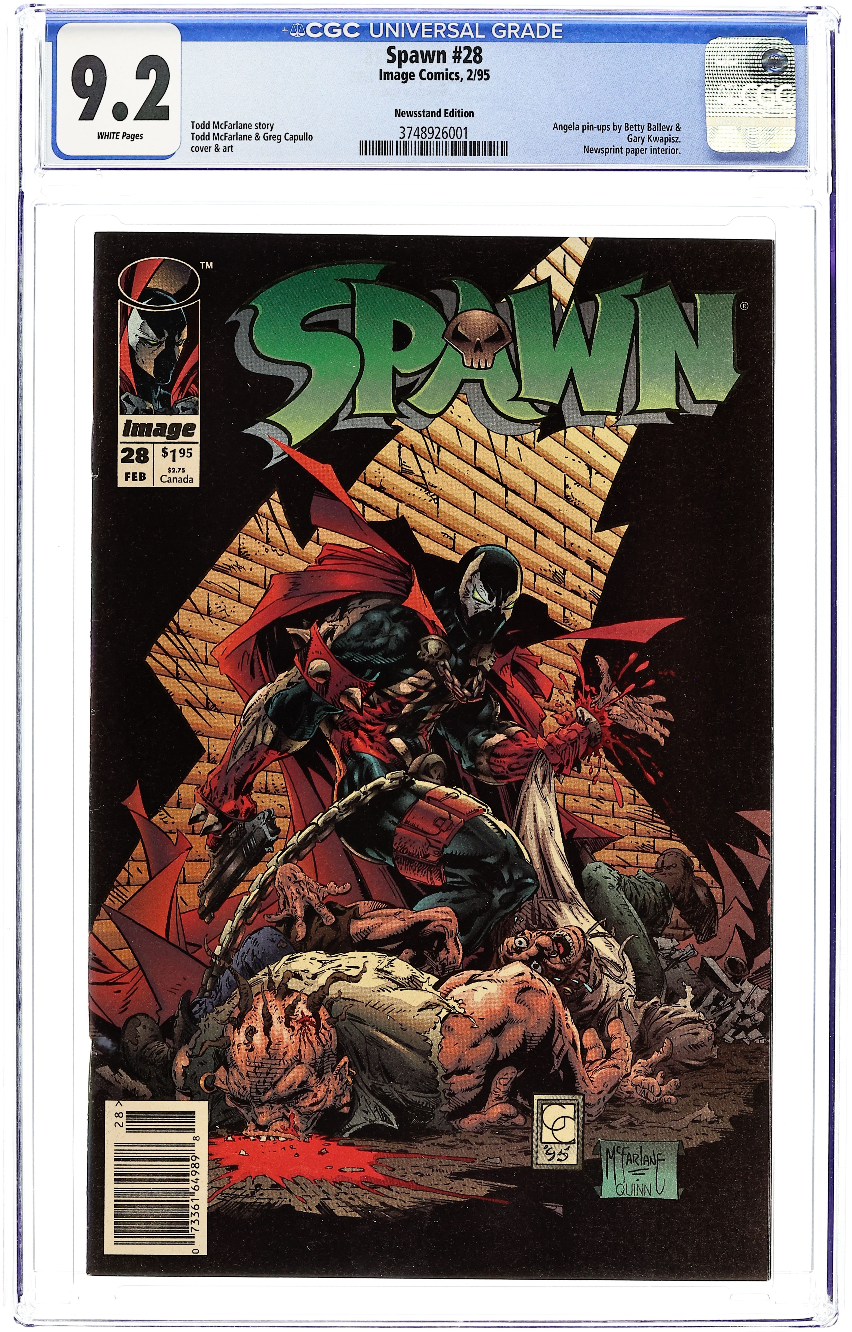 Newsstand Edition (has bar code on cover). "Protector!" Story by Todd McFarlane. Art by Todd McFarlane and Greg Capullo. Tired of all the psychos who keep attacking him and the denizens of his alleys, Spawn decides to make a haunting example of the latest creep to try and kill him. Plus, Spawn comes face-to-face with Wanda. Includes 2 pin-ups of Angela. Cover price $1.95.