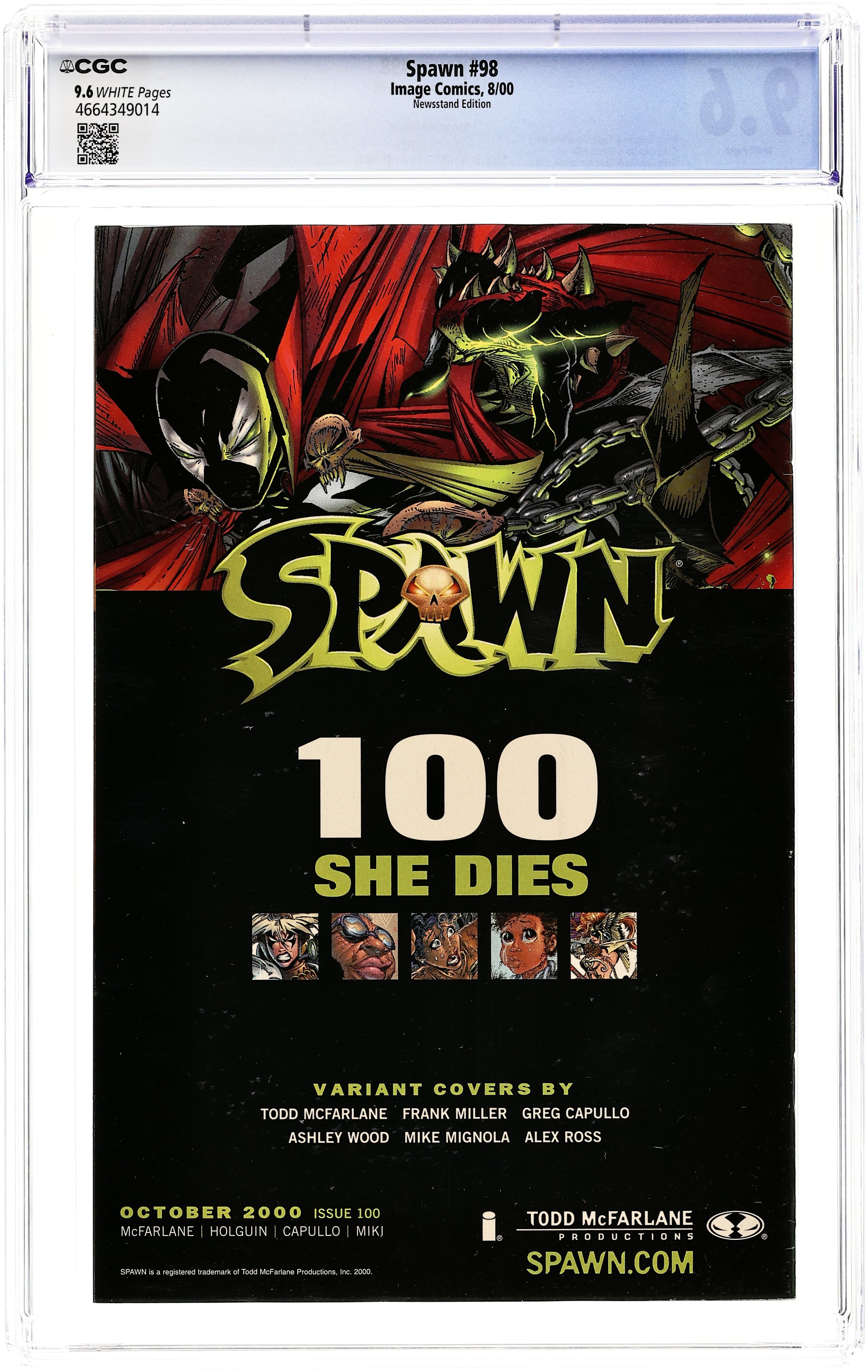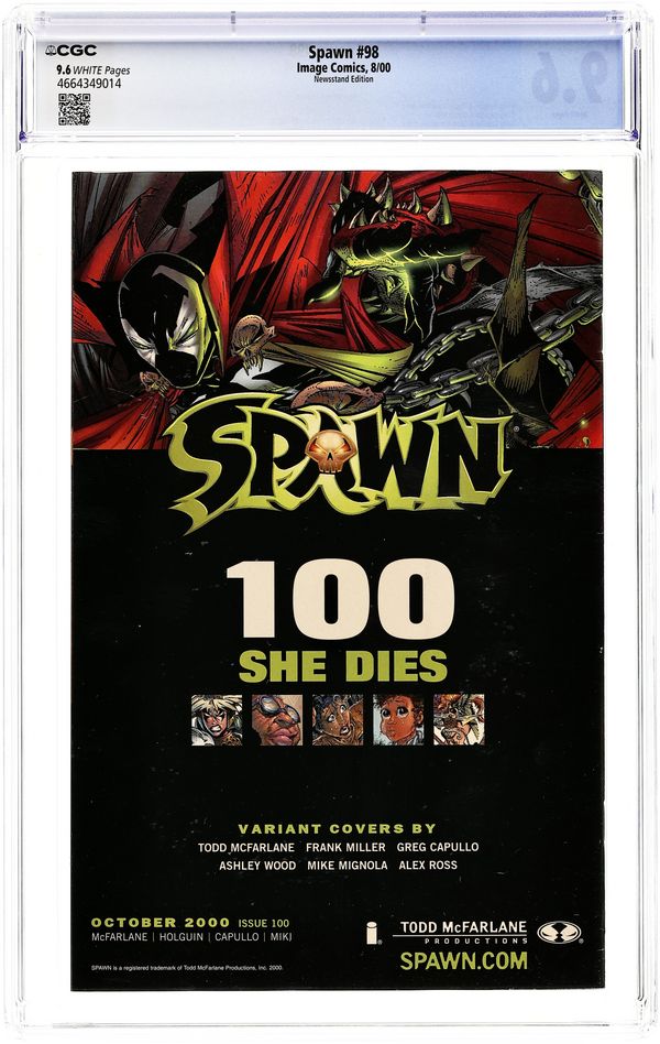 Alex Ross Cover. Story by Todd McFarlane and Brian Holguin. Pencils by Greg Capullo. Inks by Danny Miki. Color by Brian Haberlin SHE DIES?This is it! Spawn is the first Image Comic to reach its 100th issue! As Heaven and Hell stand poised on the brink of total war with only Spawn between them-"She Dies"-but who is "she?" Is it Wanda? Cyan? Angela?Tiffany? Granny Blake? This issue has it all: death, birth and other startling revelations and conclusions as Spawn faces off with his greatest adversary-Angela theHunter of Hellspawns. Spawn will be forced to make the single most important decision of his existence since the day he gave his pledge to Malebolgia ? at stake will be nothing less than the future fate of his mortal soul. FC 48 pages Cover price $4.95.