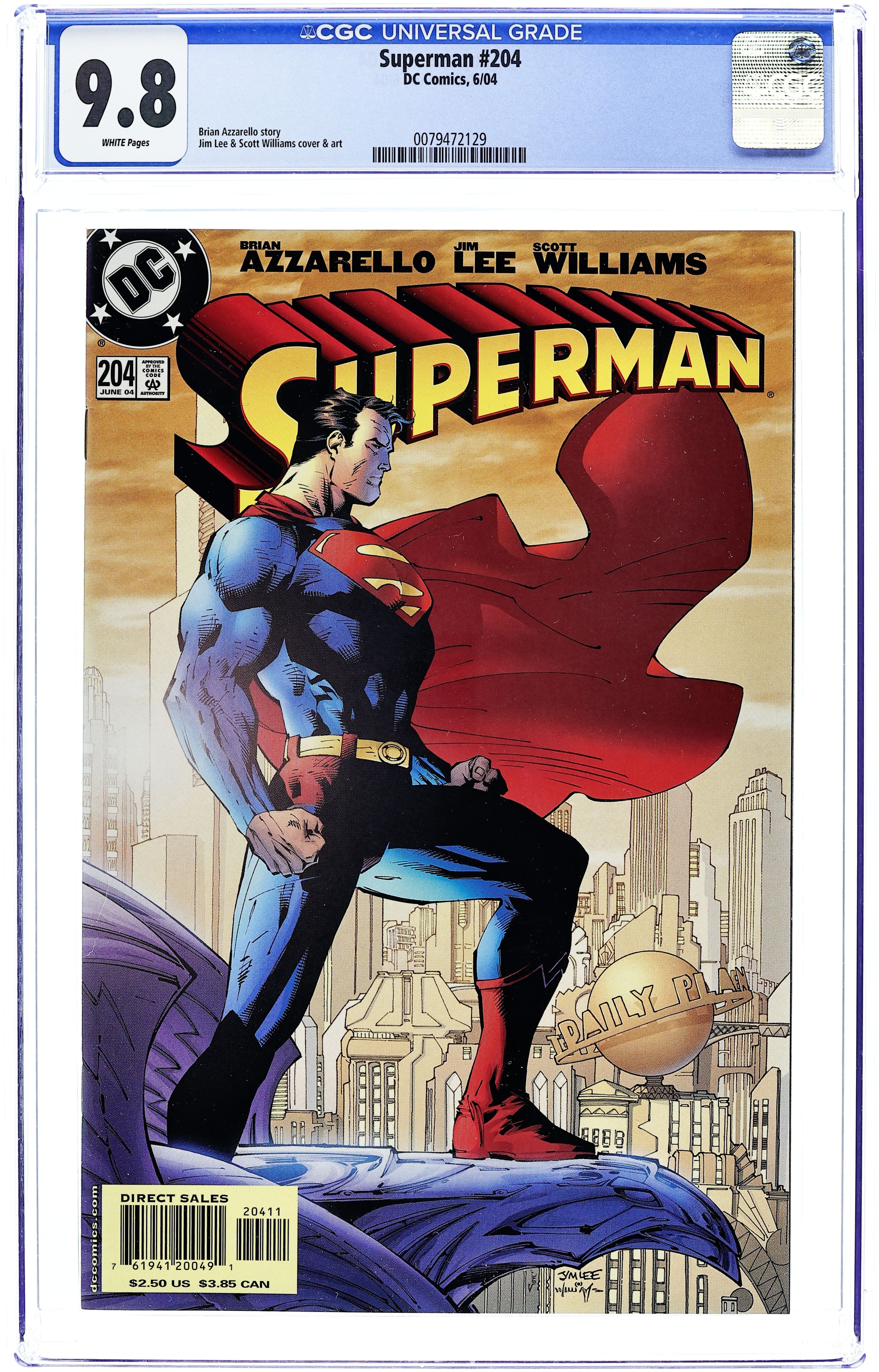 JIM LEE. Do we have your attention? You've been hearing the buzz for months, and now the main event is finally here! Fresh off his blockbuster run on BATMAN, Lee - Wizard Magazine's Best Artist of 2003 - is getting back in the ring to go twelve rounds with the Man of Steel. Along with inker extraordinaire Scott Williams, the "Hush" art team is going to give you a Superman like none you've ever seen before. BRIAN AZZARELLO. Every great fighter needs a great sparring partner, and this time around, Eisner Award-winning writer Azzarello, hot off his own best-selling 6-issue run on BATMAN, delivers the goods. Together, these heavyweights present "For Tomorrow" a 12-part storyline sure to grab readers by the throat and hold on tight. It kicks off in SUPERMAN #204, an extra- sized 40-page issue! A cataclysmic event has struck the earth. Millions of people have vanished without a trace. No one is left unaffected - not even Superman. A year has passed, and Superman is left with many questions and very few answers. For a hero who tries to have all the answers, it's torture. And just as the action heats up and the stakes are raised, one huge question emerges: Just how far is Superman willing to go "For Tomorrow"? Cover price $2.50.