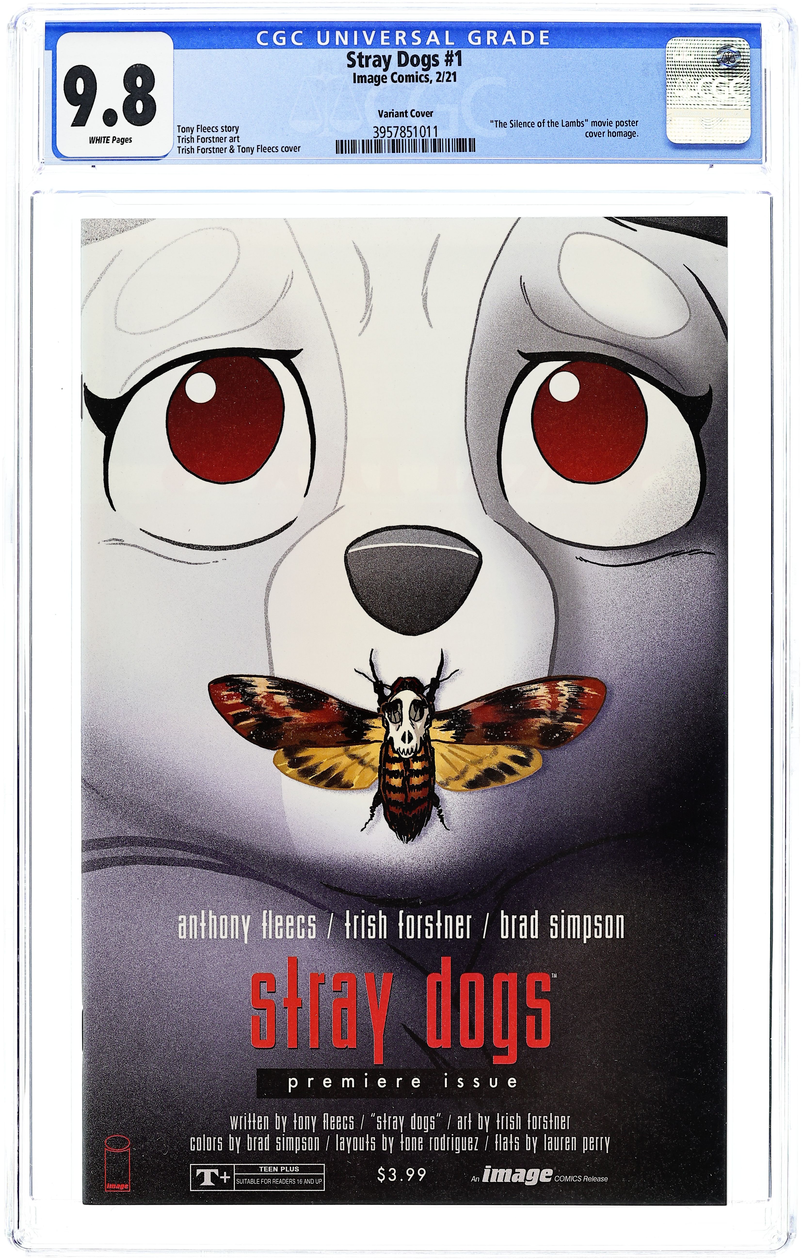Limited 1 for 50 Retailer Incentive Variant Cover. Written by Tony Fleecs. Art by Trish Forstner. Cover by Trish Forstner, Tony Fleecs. MINISERIES FINALE The STRAY DOGS adventure concludes with this giant-sized anthology issue. Take this last walk with us as we say goodbye to old friends, meet some new dogs, and make one final trip out to the Master's house of horrors. 48 pages, full color. Cover T+ Cover price $4.99.