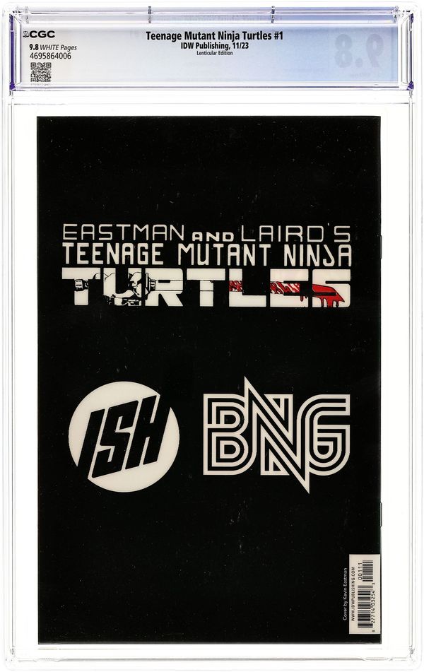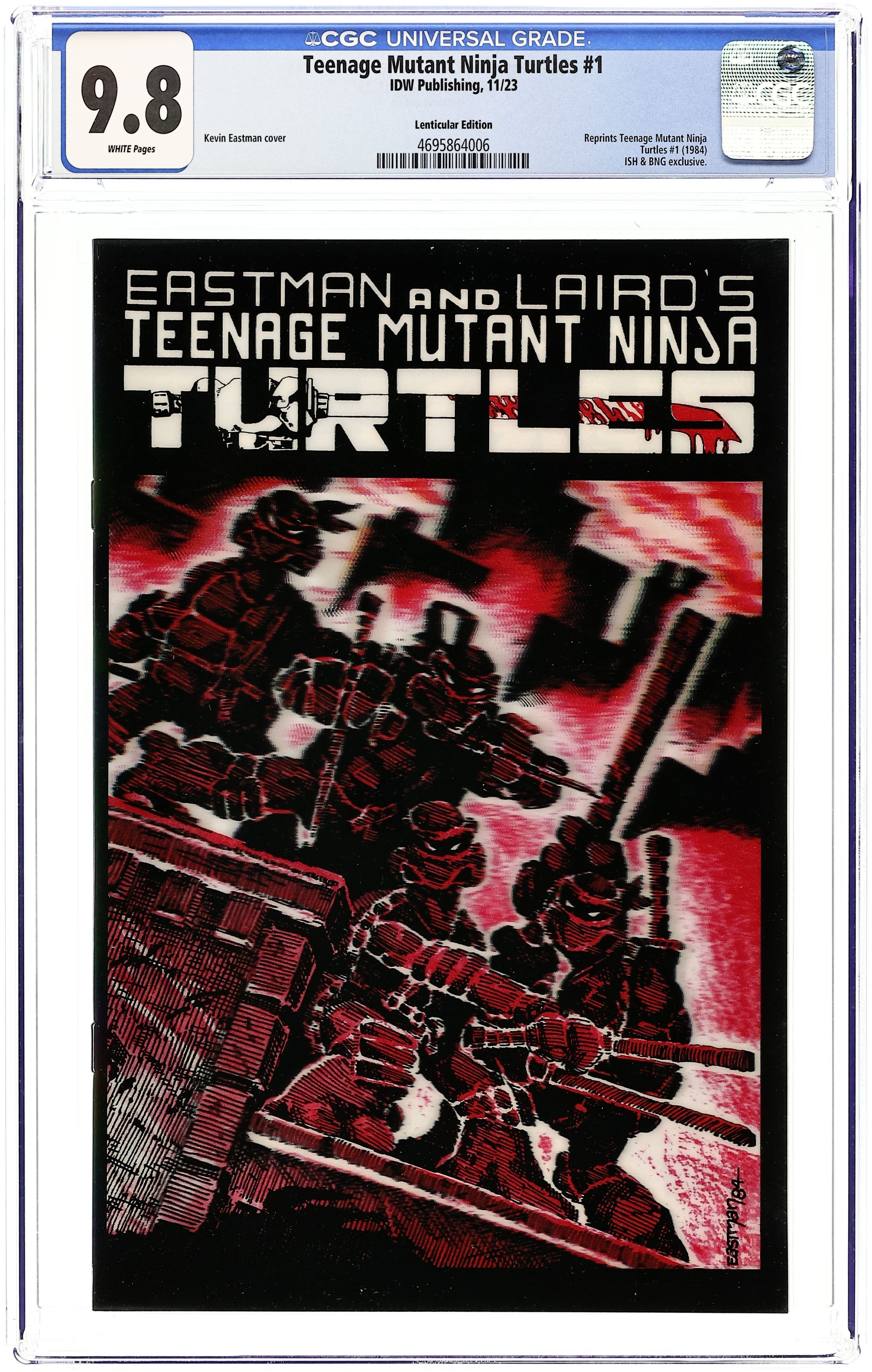 Reprint. ISH and BNG (Bottleneck Gallery) Exclusive Lenticular Edition Cover by Kevin Eastman. Reprints Teenage Mutant Ninja Turtles (1984) #1. Standard comic book size. 44 pages.