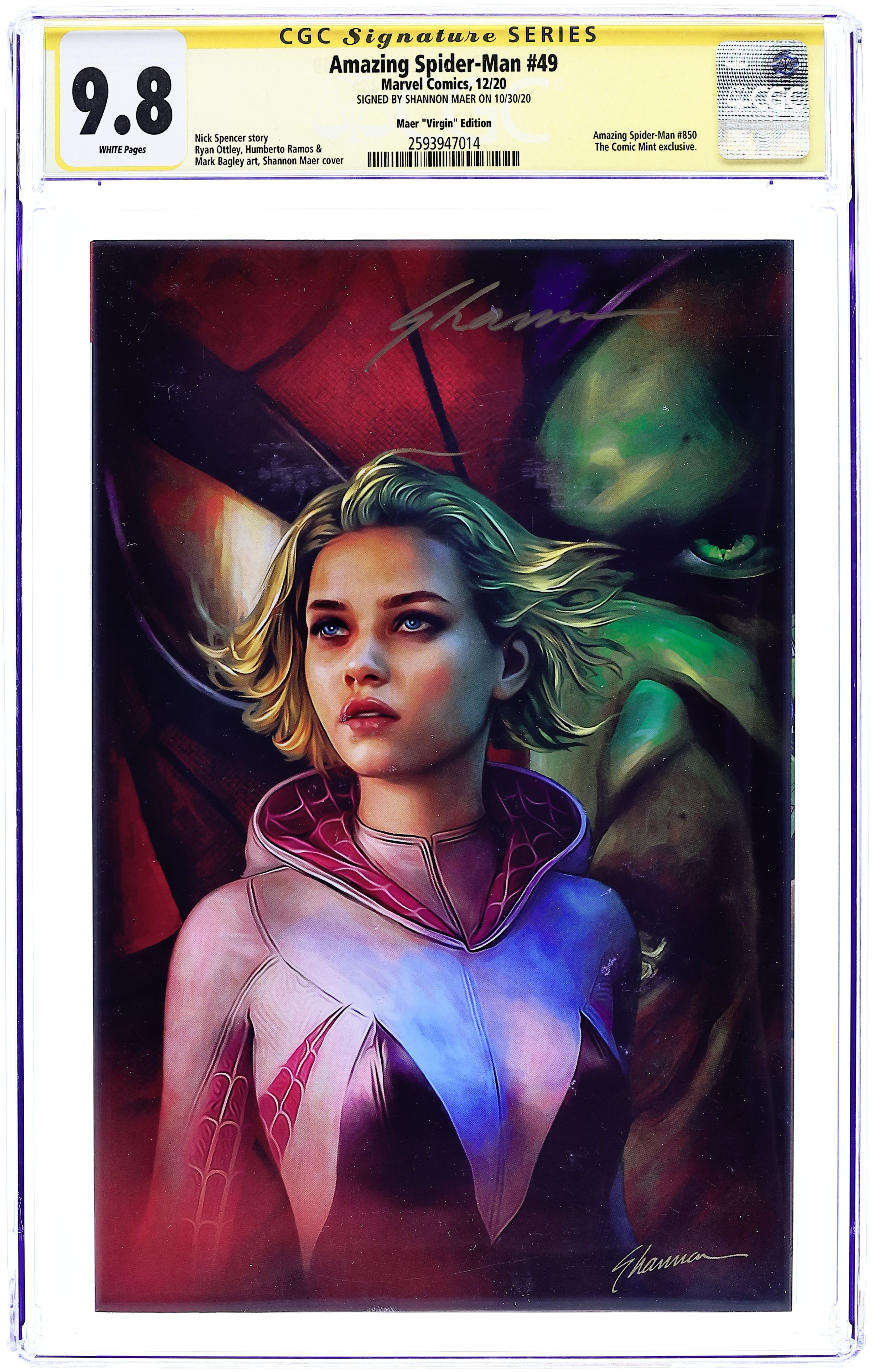 Comic Mint exclusive virgin cover by Shannon Maer. Legacy #850. Written by Nick Spencer, Kurt Busiek, Tradd Moore and Saladin Ahmed. Art by Ryan Ottley, Humberto Ramos, Mark Bagley, Chris Bachalo, Tradd Moore, Aaron Kuder, Cliff Rathburn, Victor Olazaba, John Dell and Tim Townsend. AMAZING SPIDER-MAN reaches another landmark and we're celebrating Spider-Style! As if things weren't bad enough for Spider-Man with Sin-Eater's reign of terror reaching riot level… THE GREEN GOBLIN IS BACK! Spidey has been through a lot, but even the worst things that have ever happened to Spider-Man have just been a prelude for what happens here, with an epic main story by a veritable Hall of Fame of Spider-Creators. Featuring: "The Return of the Green Goblin: Chapter One: Unstoppable" by Nick Spencer, Ryan Ottley and Cliff Rathburn; "Chapter Two: The Debt" by Spencer, Humberto Ramos and Victor Olazaba; and "Chapter Three: Your Choice" by Spencer, Mark Bagley and John Dell. Also in this issue: "All You Need Is...?" by Kurt Busiek, Chris Bachalo and Tim Townsend; "Four Shoes!" by Tradd Moore; and "A Family Affair" by Saladin Ahmed and Aaron Kuder. 96 pages, full color. Rated T