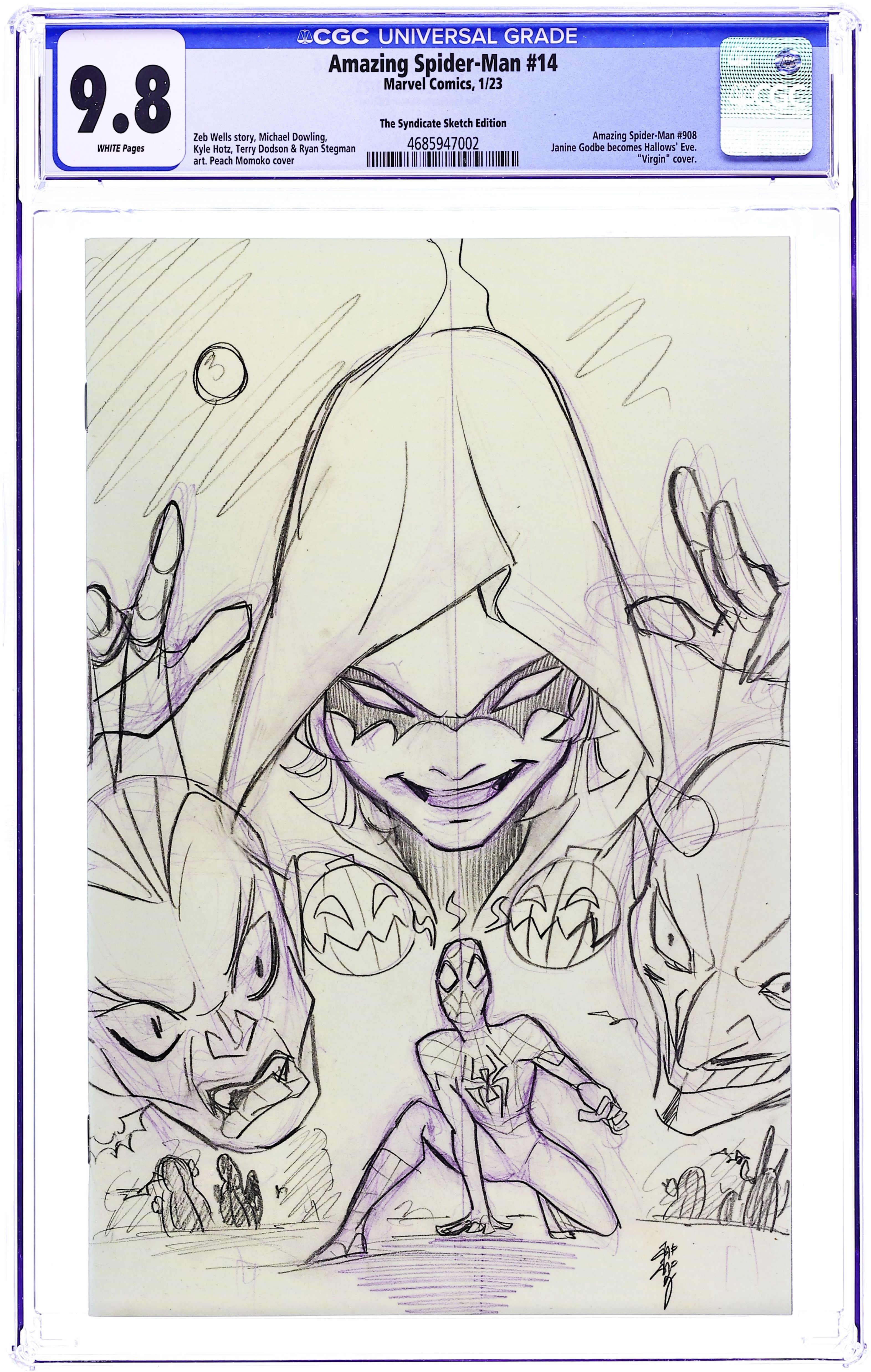 The Syndicate (616 Comics, AntiHero Gallery, Unknown Comics, Comic Traders, and Street Level Hero) Exclusive Sketch Edition Virgin Cover by Peach Momoko. Written by Zeb Wells. Art by Michael Dowling; Kyle Hotz; Terry Dodson. "DARK WEB" PRELUDE! We haven't seen Chasm since ASM #894 and the FCBD issue, but that doesn't mean he hasn't been busy. Join us for this very special issue featuring Spidey's most dangerous new villain as well as the Goblin Queen and a BRAND-NEW villain that you won't believe. 36 pages, full color. Rated T