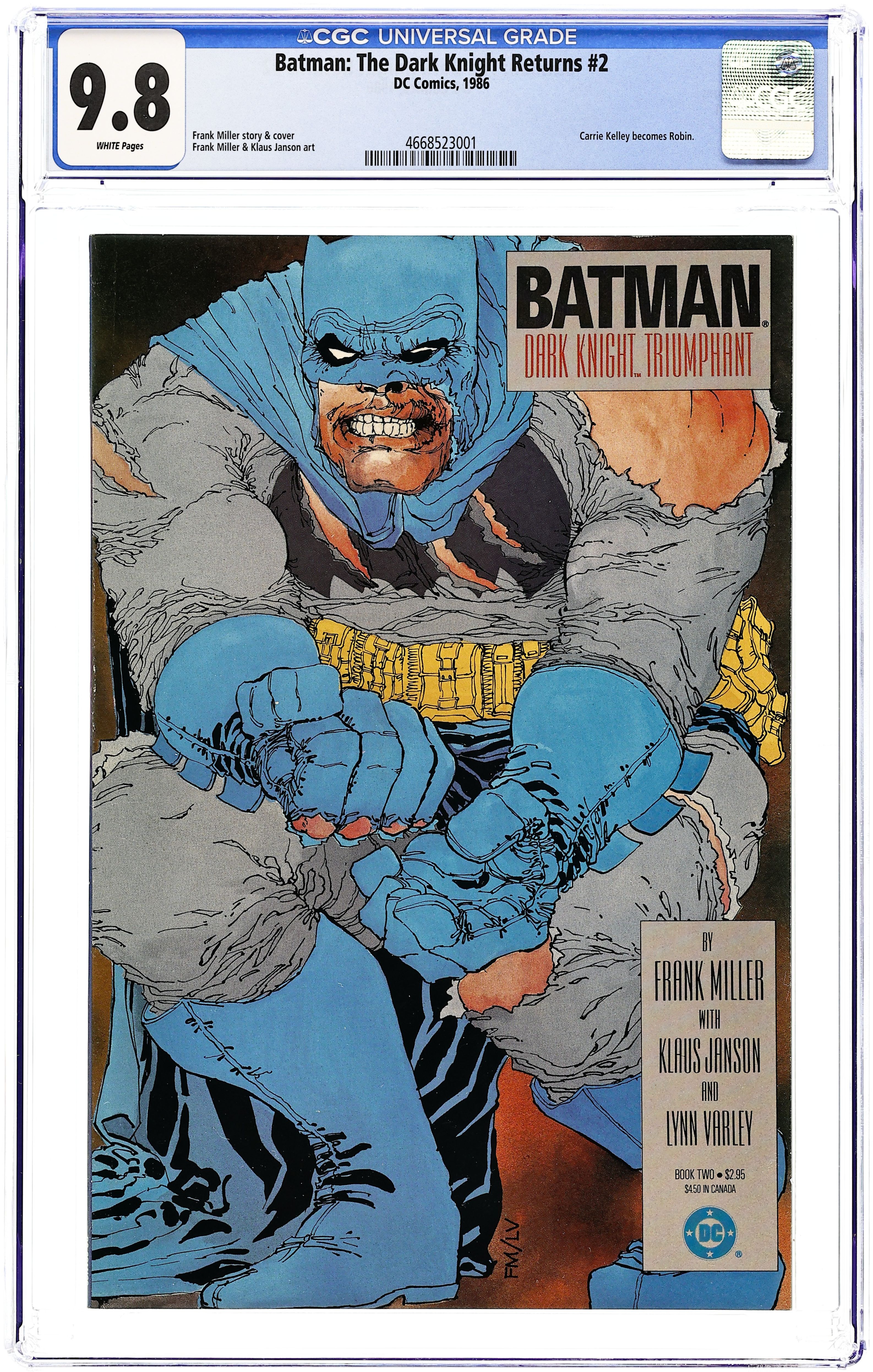 First printing. Direct Edition. NOTE: 1st printing has almost matching grey background on inside front cover and facing page. 2nd printing doesn't have matching gray background--grays are very different. 3rd printings are labeled as such. Cover by Frank Miller. "Dark Knight Triumphant," script by Frank Miller, pencils by Frank Miller, inks by Klaus Janson; an aging Batman battles the Mutant gang and their anonymous leader; While walking to work, considering retirement, Jim Gordon is almost killed by a 17-year old boy with an M60; Carrie Kelly, a young girl who owes her life to Batman, seeks out her hero and becomes Robin. 52 pgs., full color. Cover price $2.95.