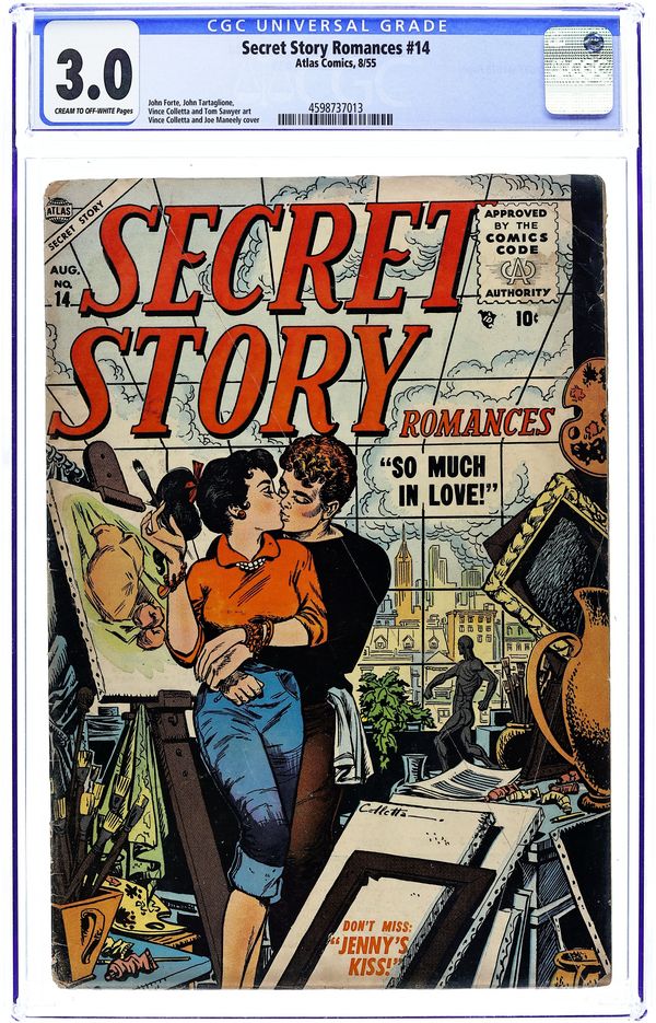 "The Buildings That Vanished" (art by Dick Ayers), "Feet of Clay," "Costume Party," "Lonely Hearts" (art by John Forte), "Welcome Home" (art by Al Hartley), and a two-page text story, "The Letter." Joe Maneely cover. Cover price $0.10.