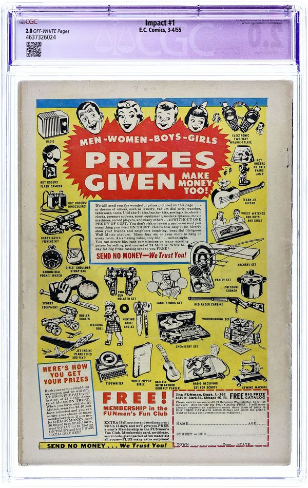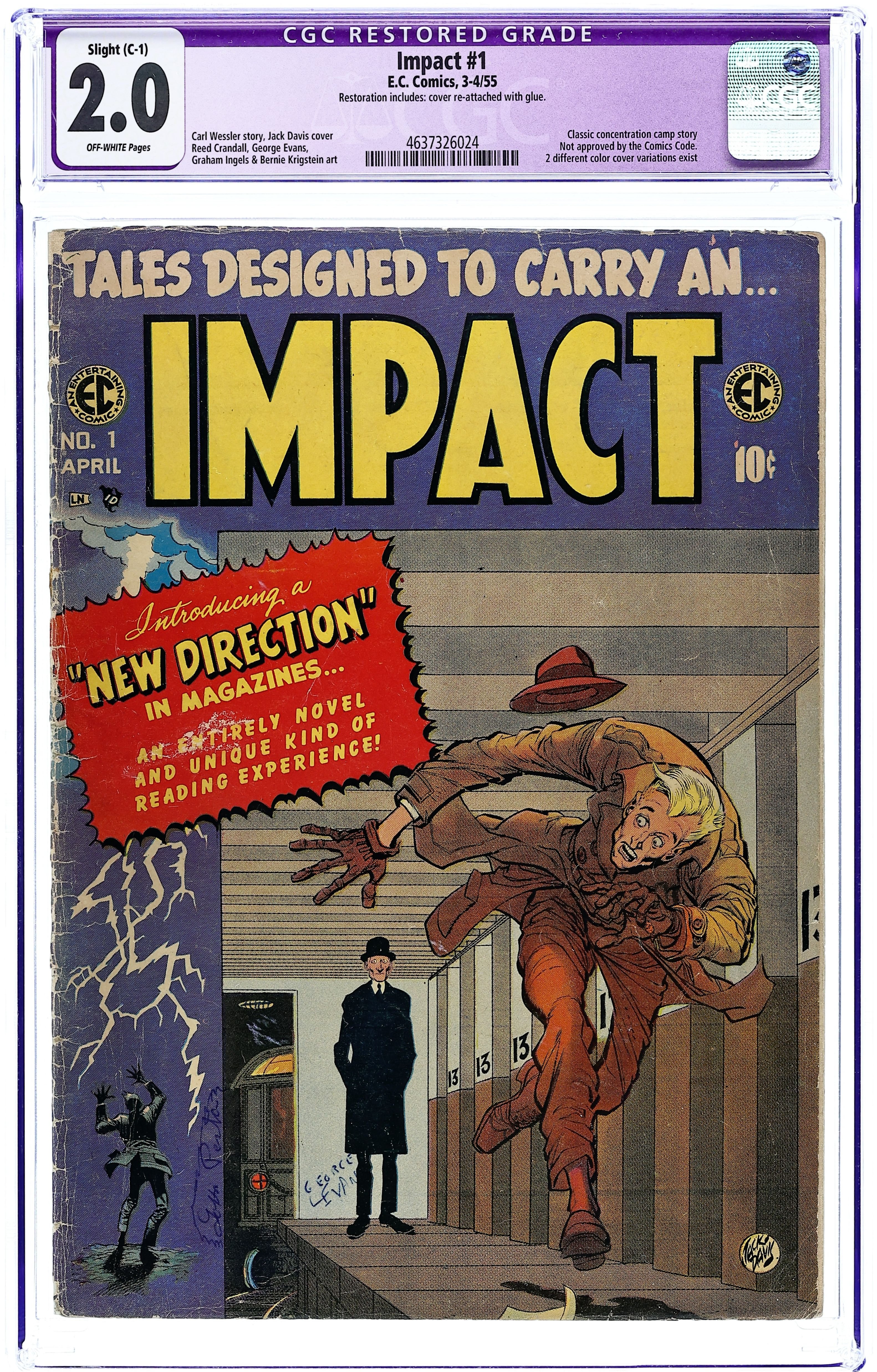 Original EC version with yellow title logo. "Tough Cop" (script by Carl Wessler; art by Reed Crandall), "The Diamond Pendant" (script by Wessler; art by Graham Ingels; based on a story by Guy de Maupassant), "The Dress" (art by George Evans), and the classic story "Master Race" (script probably by Al Feldstein, art by Bernard Krigstein). Jack Davis cover (Illustrating "Master Race"). Cover price $0.10.