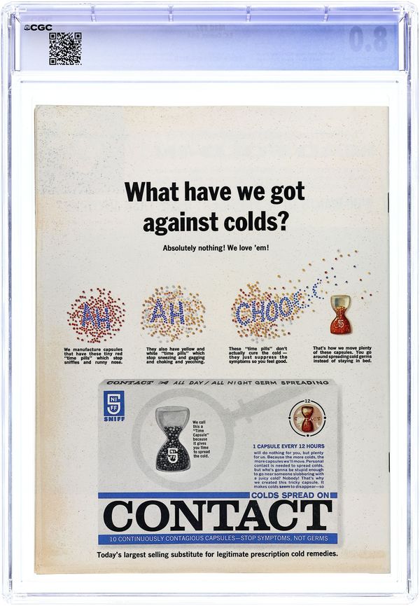 Cover art by Kelly Freas. "A Realistic Children's Book For Realistic Children," script by Gary Belkin and Pearl Belkin, art by Joe Orlando. "The Inventor," script and art by Don Martin. "How Madison Avenue Could Sell America to the World," art by Bob Clarke; Altering famous advertising campaigns so the product they sell is the United States. "Spy Vs. Spy," script and art by Antonio Prohias; The Black Spy uses a sonic attack against the White Spy. "Television Programs Aimed at Late, Late Audiences," script by Frank Jacobs, art by Wally Wood; Television programs targeted to specific demographics known to be up overnight. "A Mad Look at the Beach," script and art by Dave Berg. "A Mad Guide to Classified Ad Abbreviations," script by Tom Koch, art by George Woodbridge; Satirical classified ad abbreviations. "Mad's Custom Career-Designed European Tours," script by Don Reilly, art by Jack Rickard. "TV Commercials With Suspense," script by Tom Koch, art by Bob Clarke; Altering familiar television commercials to create suspenseful endings. "Medical Illustrated," script by Larry Siegel, art by George Woodbridge; Satirical version of a magazine geared toward physicians. "Mad's Auto Travel Games," script by Tom Koch, art by Joe Orlando; Games that can occupy children during long car trips. "Karate," script by Jack Mendelsohn, art by Bob Clarke; Satirical look at the martial art of karate. "The Good Doctor in Africa," script and art by Don Martin; An African explorer gets a surprise. "The Jack Kennedy Show," script by Gary Belkin, art by Mort Drucker; What if President John Kennedy hosted a television talk show like NBC's The Tonight Show? Parody of Cadillac print ads, art by Kelly Freas. 52 pgs., B&W. Cover price $0.25.