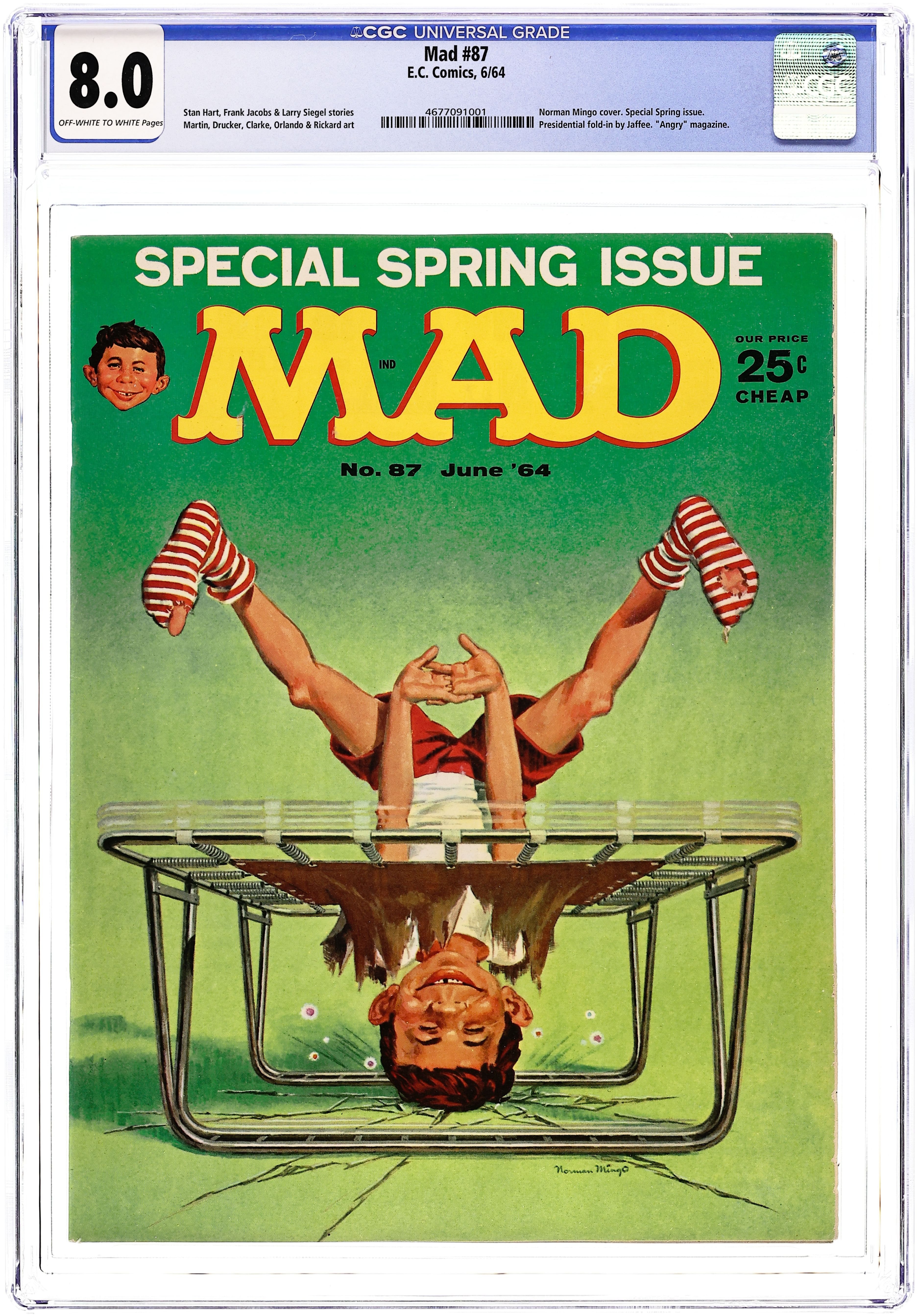 Cover art by Norman Mingo. "Kids' Versions of Adult Films," script by Stan Hart, art by Mort Drucker; Serious dramatic films sanitized and altered to appeal to a pre-teen audience. Films parodied are "Days of Wine and Roses", "The Hustler", "Irma La Douce" (with an all funny animal cast), "Never on Sunday" and "Monte Cane." "At the Mask Store," script and art by Don Martin; Merry mix-ups at a costume shop. Cartoons in the margins by Sergio Aragones. "Spy Vs. Spy," script and art by Antonio Prohias. "TV Ads We'd Like to See," art by Joe Orlando. "A Mad Look at the Circus," script and art by Sergio Aragones. "The Lighter Side of Home Owners," script and art by Dave Berg. "Pre-Recorded Phone Messages," script by Larry Siegel and Frank Jacobs, art by Mort Drucker; Answering machine messages designed to discourage certain callers. "The Electrician," script and art by Don Martin. "Angry," script by Stan Hart, art by George Woodbridge; A niche magazine for people with violent tempers. "Who Wants to Be President More than Anything" Mad Fold-In by Al Jaffee. 52 pgs., B&W. Cover price $0.25.