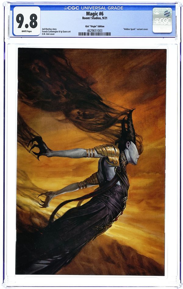 Hidden Spark Virgin cover by E.M. Gist. Written by Jed MacKay. Art by French Carlomagno, Ig Guara. How does the ancient past hold the key to the future of the entire Multiverse? Ral, Vraska, and Kaya have finally tracked down the being that can help them unravel the true nature of the threat they face - Jaya Ballard, one of the oldest living, and most experienced, Planeswalkers in existence. And the key to understanding lies in Jaya's origins during the Age of Ice in Dominaria⦠and a threat that was neutralized, but never truly eliminated. 24 pages, full color. Cover price $4.99.