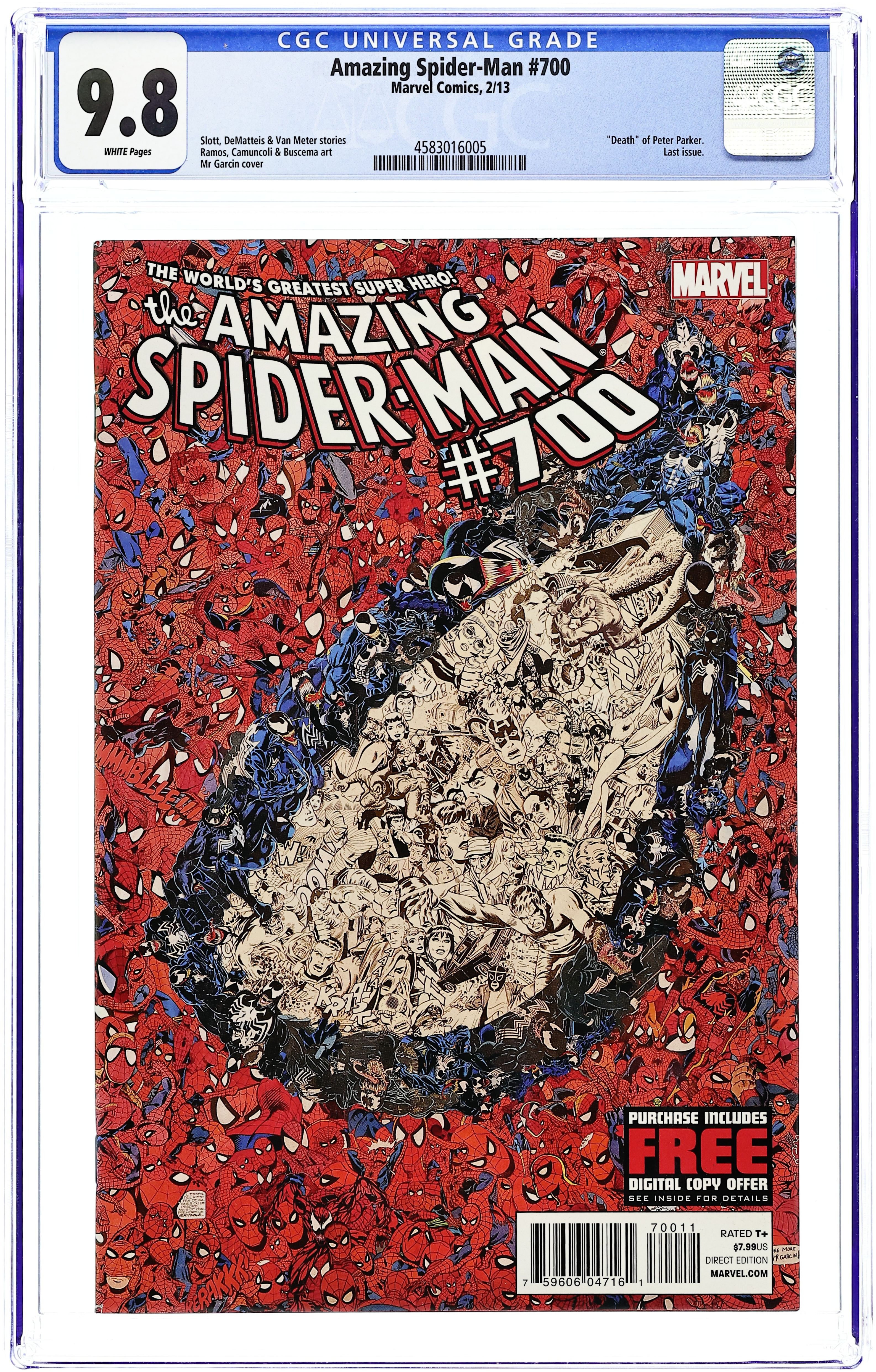 Direct Edition. Dying Wish: Part 2 of 2. Written by Dan Slott, J.M. DeMatteis and Jen Van Meter. Art by Humberto Ramos, Giuseppe Camuncoli, Stephanie Buscema, Victor Olazaba and Sal Buscema. Cover by Mr Garcin. Marvel Comics proudly presents the end of a 700 issue era! Featuring "Dying Wish: Suicide Run" by Dan Slott, Humberto Ramos and Victor Olazaba. Plus these extra amazing, spectacular and sensational stories: "Spider-Dreams" by J.M. DeMatteis, Giuseppe Camuncoli and Sal Buscema, and "Date Night: A Black Cat Storybook Adventure!" by Jen Van Meter and Stephanie Buscema. Also: cover gallery featuring all 700 Amazing Spider-Man covers; special previews of the all-new Spidey books; and the final Amazing Spider-Mail featuring Stan "The Man" Lee answering your questions! 104 pages, full color. Rated T+ Cover price $7.99.