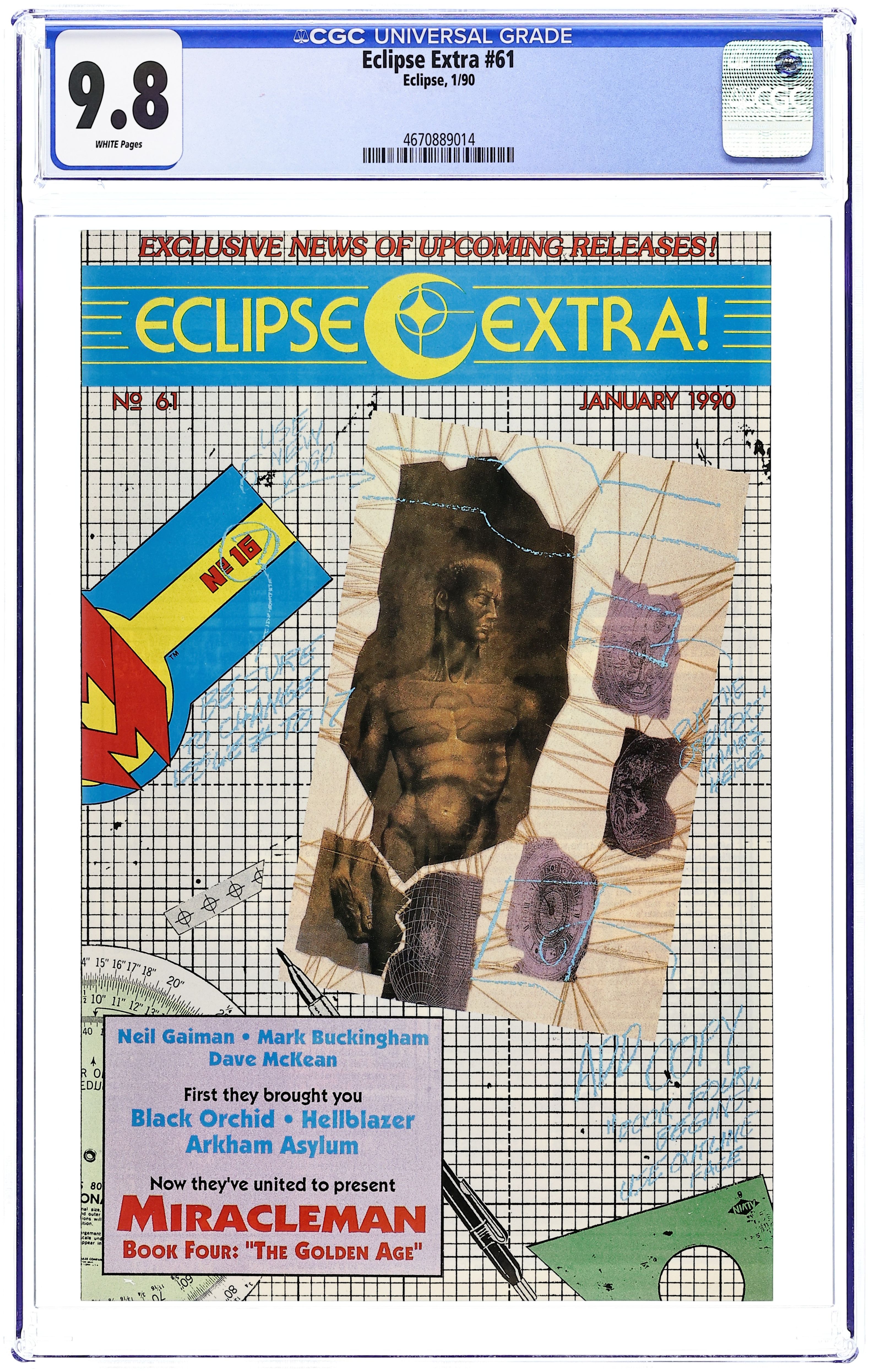 Exclusive news of upcoming releases! Cover blurb: "Neil Gaiman, Mark Buckingham and Dave McKean...first they brought you Black Orchid, Hellblazer and Arkham Asylum...now they've united to present Miracleman Book Four: The Golden Age."