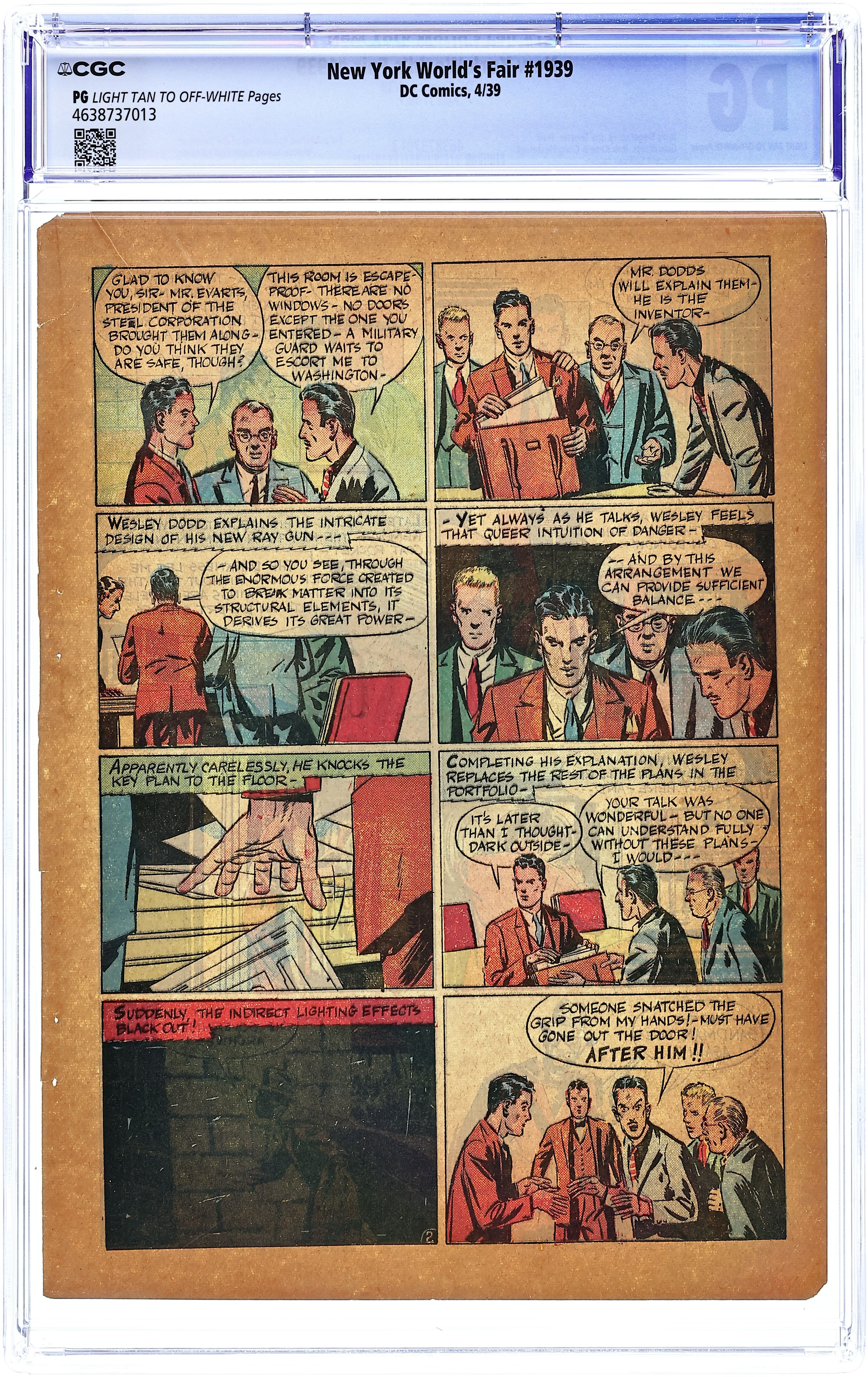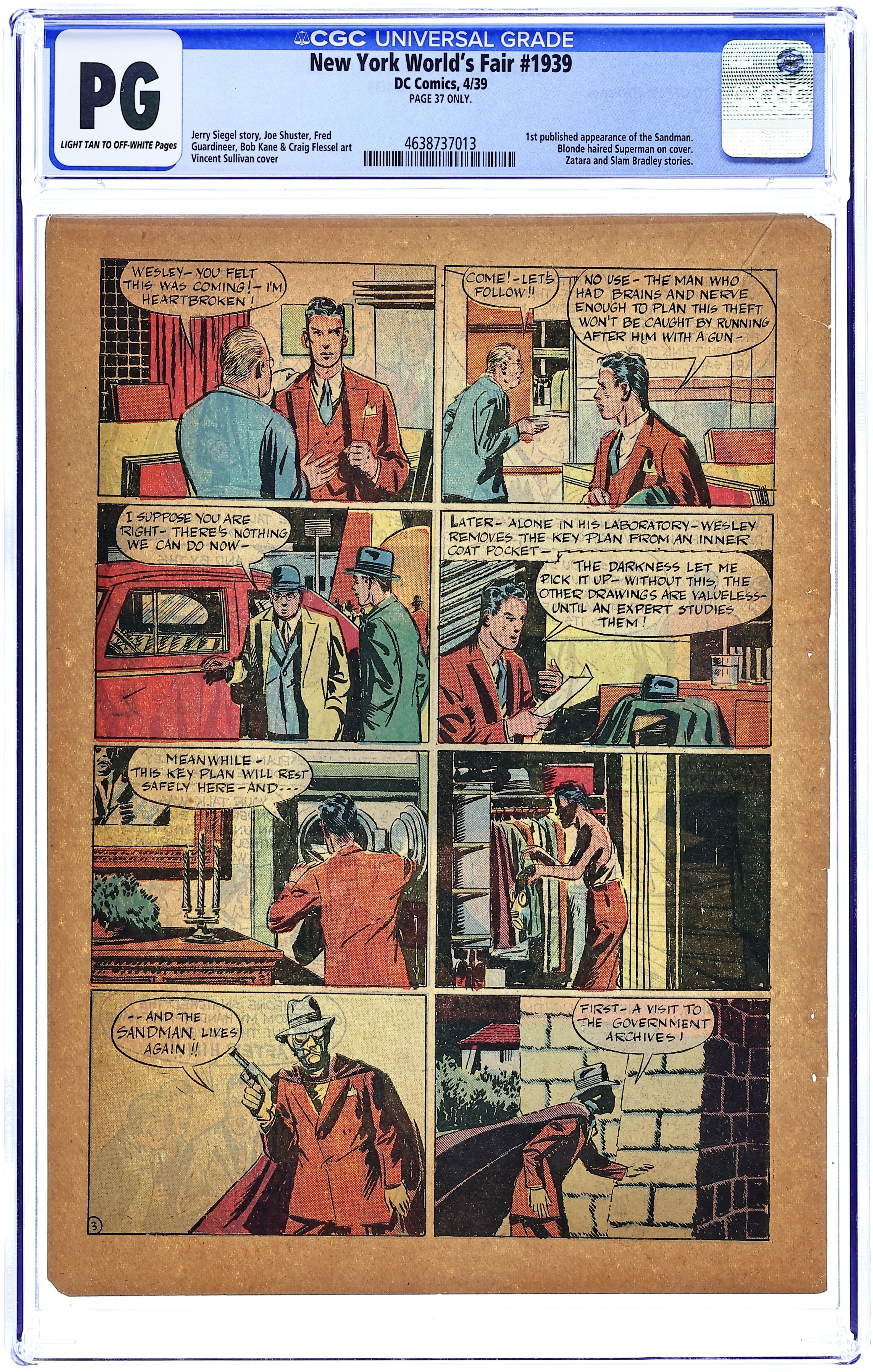 Superman (by Jerry Siegel and Joe Shuster), Scoop Scanlon (by Bill Ely), Sandman (first published appearance), Zatara (by Fred Guardineer), Slam Bradley (by Siegel and Shuster), Ginger Snap (by Bob Kane), Butch the Pup, ":Hanko Goes to the World's Fair," and "A Day At the World's Fair" (by Creig Flessel). Vincent Sullivan cover (Superman with blond hair). Cover price $0.15.