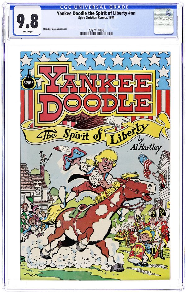 Yankee Doodle Spirit of Liberty (1984), the Special Freedom Council Edition, is a promotional comic book published by Fleming H. Revell Co. Yankee Doodle landed with the Pilgrims, rode with Paul Revere, crossed the Delaware with George Washington, opened the frontier with Davy Crockett, and walked on the moon with Neil Armstrong. Yankee Doodle is the Spirit of Liberty, and this a story of America's history and the Bible's place in it. 32 pages, full color, 6.5-in. x 10.25-in.