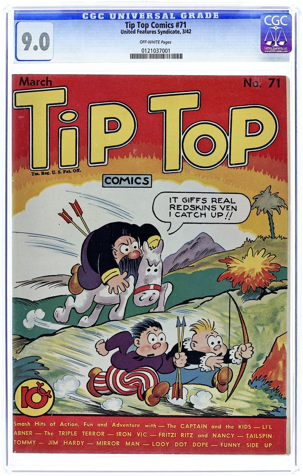 Cover by Rudolph Dirks. Stories and art by Al Capp, Ernie Bushmiller, Rudolph Dirks, Gus Mager, Dick Moores, Fred Methot, Reg Greenwood, Hal Forrest, Bernard Dibble, and John Hix. Sometimes listed as Tip Top Comics Vol. 6 #11. Tip Top Comics presented color reprints of United Features newspaper comic strips. Acting on a tip that Nazi prisoners of war in Canada are being spirited across the border, The Mirror Man springs into action. Iron Vic discovers a Seminole who is "the most natural slugger I ever saw," and tries to convince him to leave his home in the Everglades and become a pro ball player. Adopted by wealthy, dying Herkimer Hosschild the 12th as his heir, Li'l Abner has only one challenge: to find a wife. Li'l Abner; The Captain and the Kids; The Mirror Man; The Triple Terror; Jim Hardy; Stamp Tips; Looy Dot Dope; Tailspin Tommy; Iron Vic; Phil Fumble; Fritzi Ritz; Strange as It Seems. 64 pages, Full Color. Cover price $0.10.