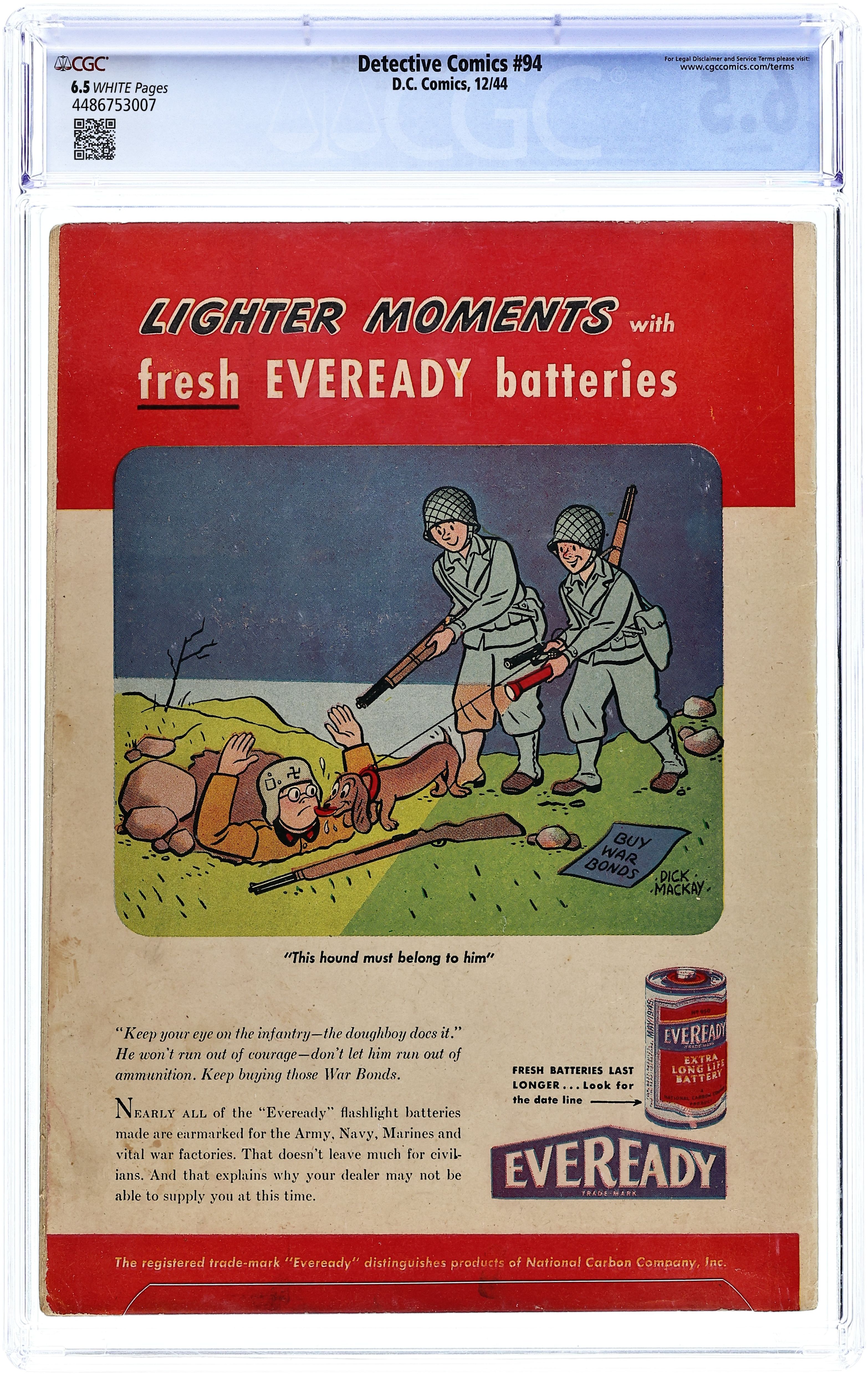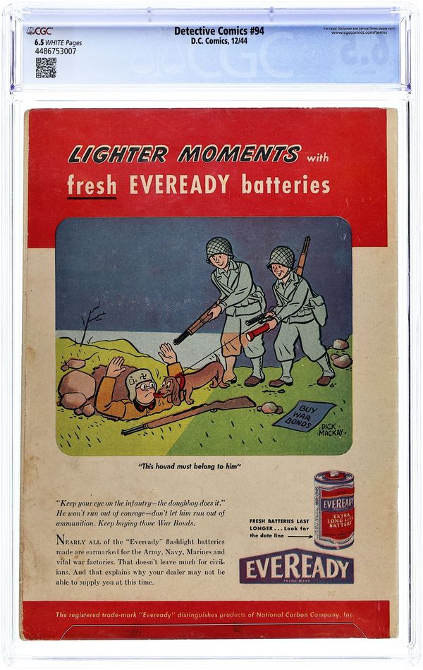 Cover by Dick Sprang. Stories by Joe Greene, Jack Farr and unknown. Art by Dick Sprang, Jack Farr, Howard Sherman, George Roussos and unknown. The Batman tracks down the unusual safe that holds the loot taken years before by the Slasher's mob. With the Slasher supposedly dead, the villain has left behind a note leading the Caped Crusaders to that safe: a safe having 7 switches, only one of which opens the safe; the rest are connected to a bomb! Don't miss Batman and Robin in "The Secret of the Switch!" by Joe Greene and Dick Sprang. Plus: Three-Ring Binks in an untitled story by Jack Farr; Slam Bradley in "Call of Death!" with art by Howard Sherman; Air Wave in "Doubling in Danger!" with art by George Roussos; and The Boy Commandos in "He Swings Through the Air!" Also: Gags, Groans 'n' Giggles 1-pager by Lit-Win; 2-page text story "Too Much for Granted" by Eddie Bell; and Billy Brand 1-pager. 52 pages, full color. Cover price $0.10.