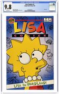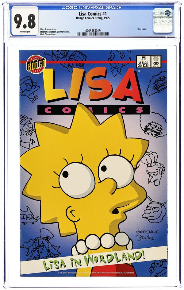 Cover art by Mili Smythe. Lisa's Adventures in Wordland, script by Mary Trainor, pencils by Mili Smythe (layouts), Stephanie Gladden, Bill Morrison, and Chris Clements, inks by Stephanie Gladden, Bill Morrison, and Chris Clements; Lisa has an Alice in Wonderland type dream; App. by Lisa Simpson; Snowflake; Marge Simpson; Ned Flanders; Bumblebee Man; Sideshow Bob Terwilliger; Otto Mann; Bob Mann; Patty Bouvier; Selma Bouvier; Mr. Burns [Charles Montgomery Burns]; Waylon Smithers; Hans Moleman; and Chief Wiggum. The Secret Life of Lisa Simpson article by Matt Groening. Profile of artist Mili Smythe, art by Bill Morrison. 36 pgs., full color. Cover price $2.25.
