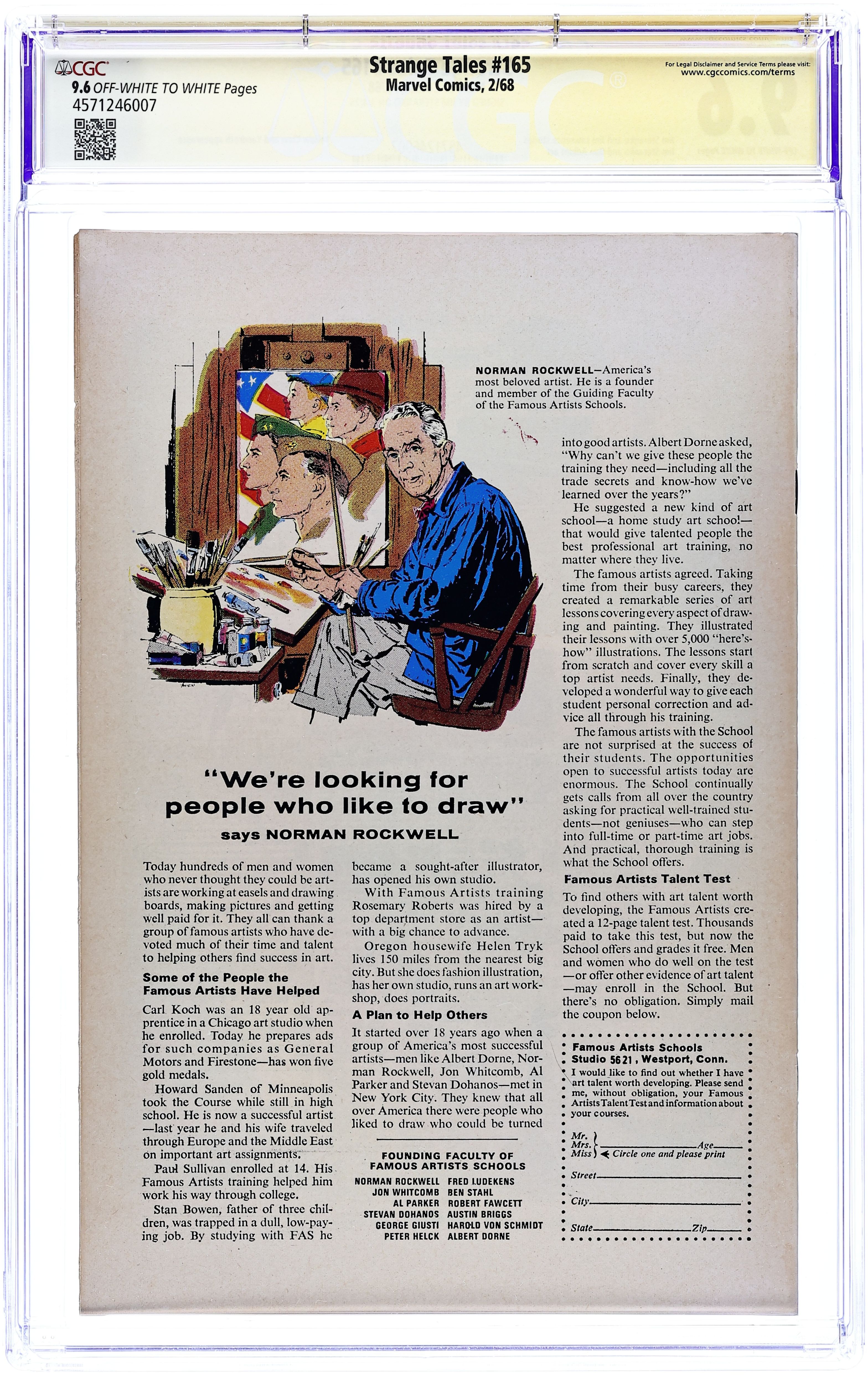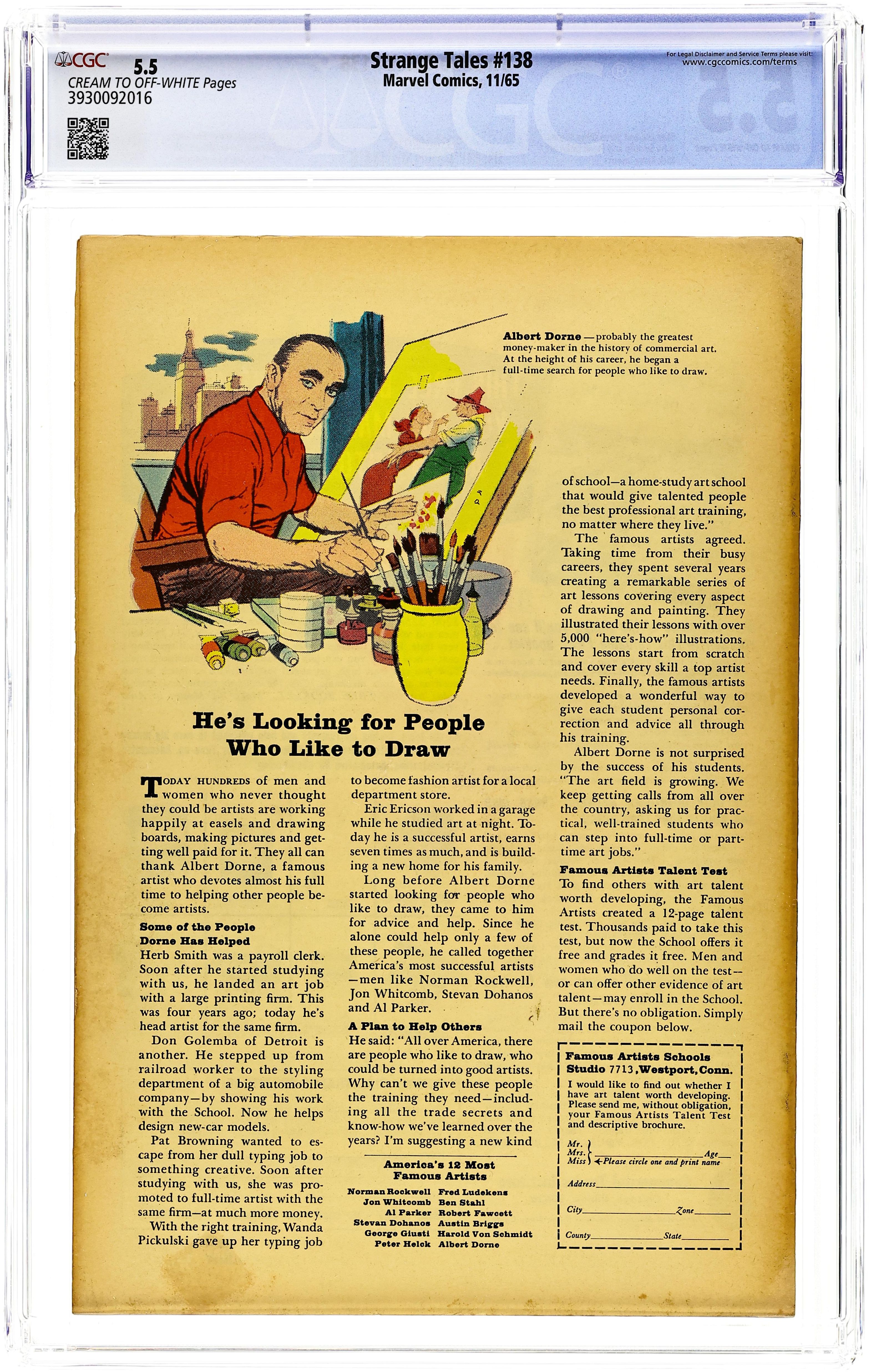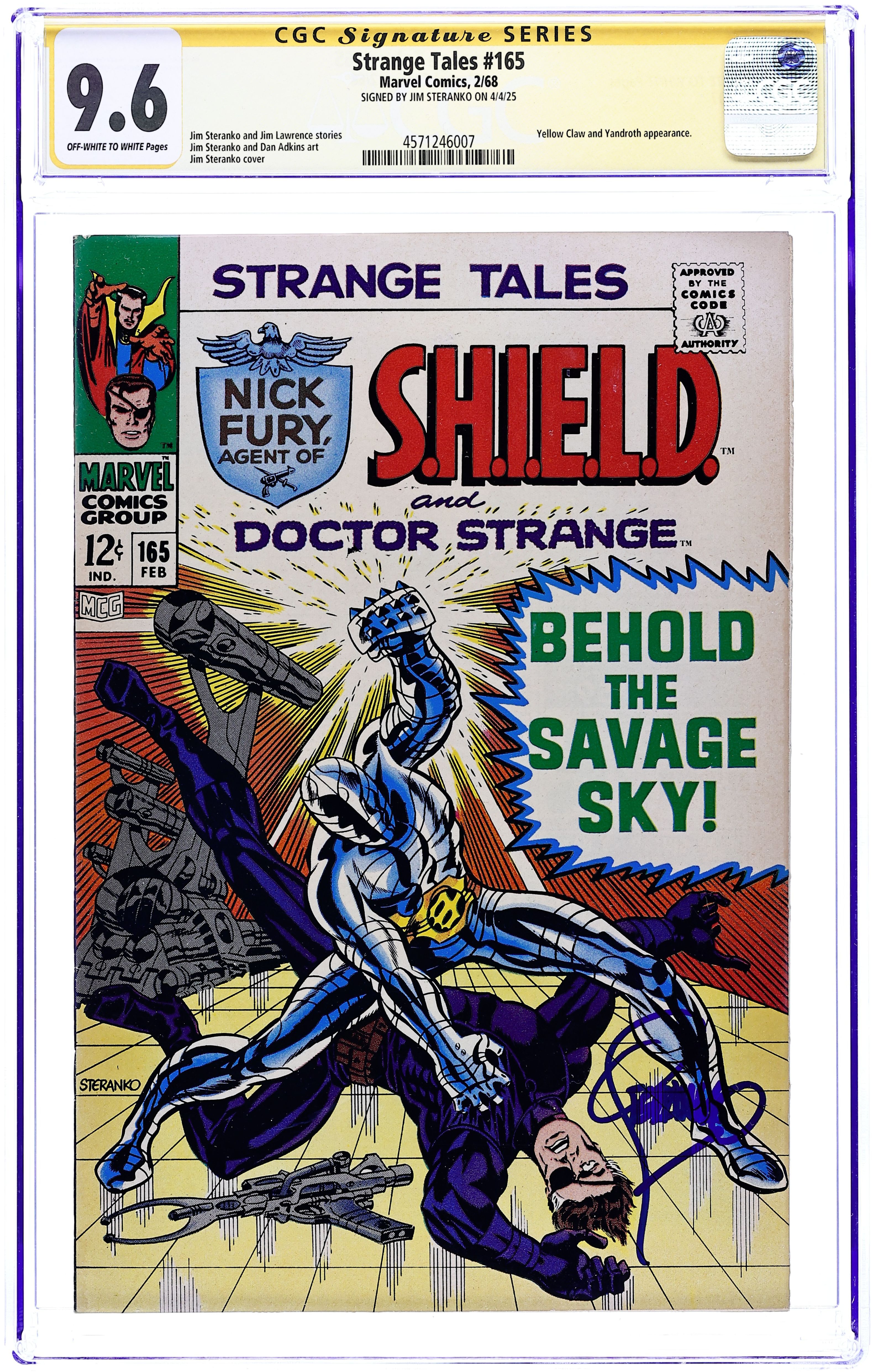 Cover pencils by Jack Kirby, inks by Chic Stone. Doctor Strange reprints: "The Defeat of Dr. Strange" (from Strange Tales 130), script by Stan Lee, art by Steve Ditko; Dormammu agrees to give Mordo power without limit so that he may destroy Dr. Strange; In Tibet, Mordo and two followers attack; Strange manages to whisk his aging mentor to safety; As Strange leaves his mentor with a loyal hermit, Dormammu sends spirits to search for him; Strange attempts to lure the spirits away from his weakened mentor; In Hong Kong, Strange contacts The Ancient One's accountant, who gets him a passport while he rests. "The Hunter and the Hunted" (from ST 131), script by Stan Lee, art by Steve Ditko; In the far East, Strange is on the run from Mordo and his minions, unaware that Mordo's increased power comes from Dormammu; As Mordo forcibly recruits more followers to search for Strange the mage makes plans to hop a plane to New York City; The Wraiths discover him, and only by conning them into believing he's vanished is he able to make his getaway. 36 pgs., full color. Cover price $0.25.