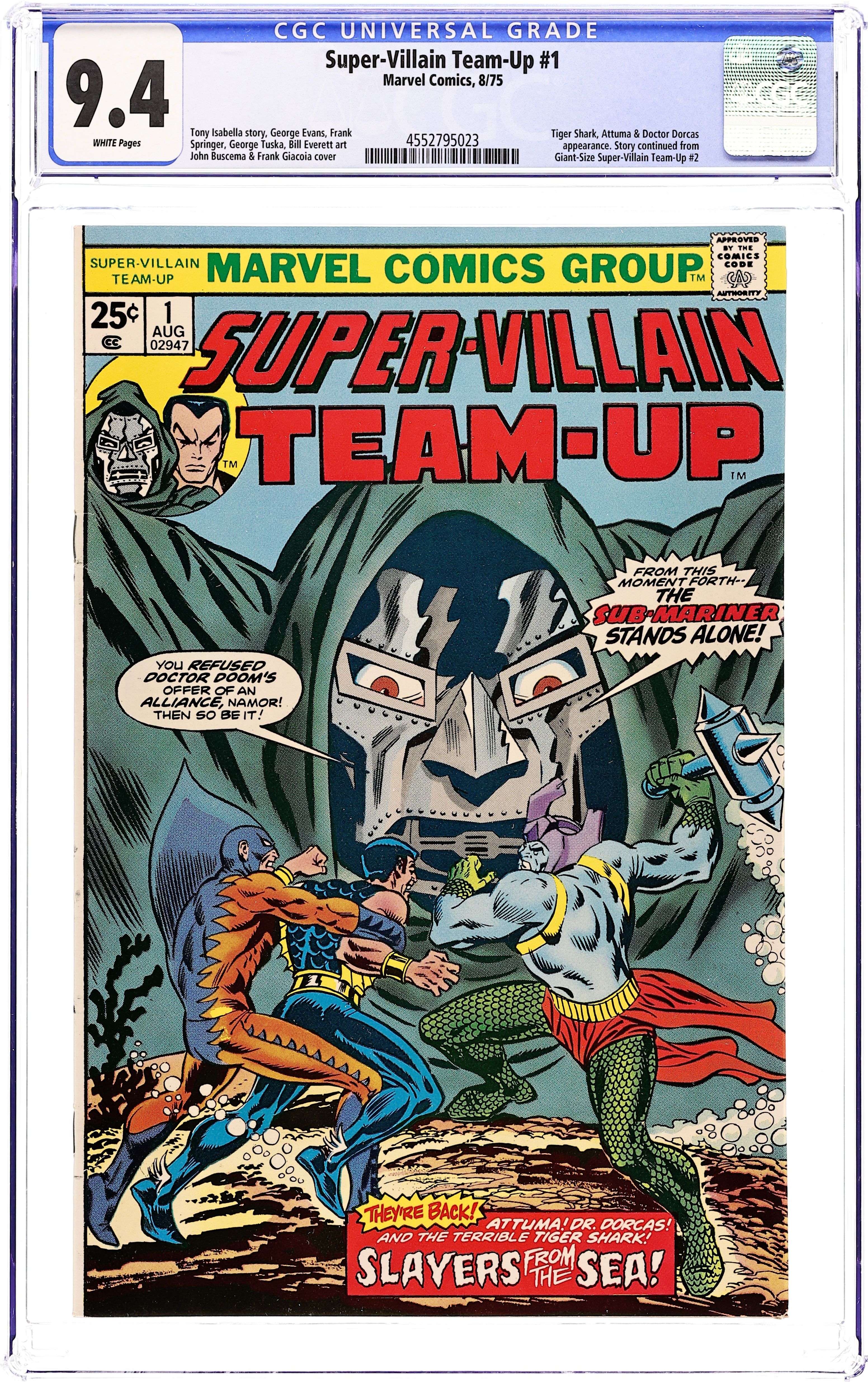 "Slayers from the Sea!" Script by Tony Isabella. Pencils by George Tuska and Bill Everett (chapter 1) and George Evans (chapter 2). Inks by Fred Kida (chapter 1) and Frank Springer (chapter 2). Cover by Ron Wilson and Frank Giacoia. Story continues from Giant-Size Super-Villain Team-Up 2. The Sub-Mariner leaves Latveria after having second thoughts about forming an alliance with Doctor Doom. Following Prince Namor's departure, the Latverian monarch realizes that he does in fact need help for his various plans of conquest and decides to reach out to the Prince of Atlantis. Meanwhile, the Sub-Mariner visits Hydro-base and is ambushed by a trio of villains: Tiger Shark, Doctor Dorcas, and Attuma! A super slugfest erupts on land and under the sea! Will the Avenging Son prevail? Flashback cameo appearances by the Fantastic Four, Daredevil, Quicksilver, Spider-Man, Thor, and the Hulk to recap Doctor Doom's previous battles through the years. (Notes: This issue features Bill Everett's last published artwork on the Sub-Mariner, the character he created in the golden age. This issue also contains a full-page ad for Hostess Twinkies featuring Captain Marvel vs. Nitro.) Cover price $0.25.