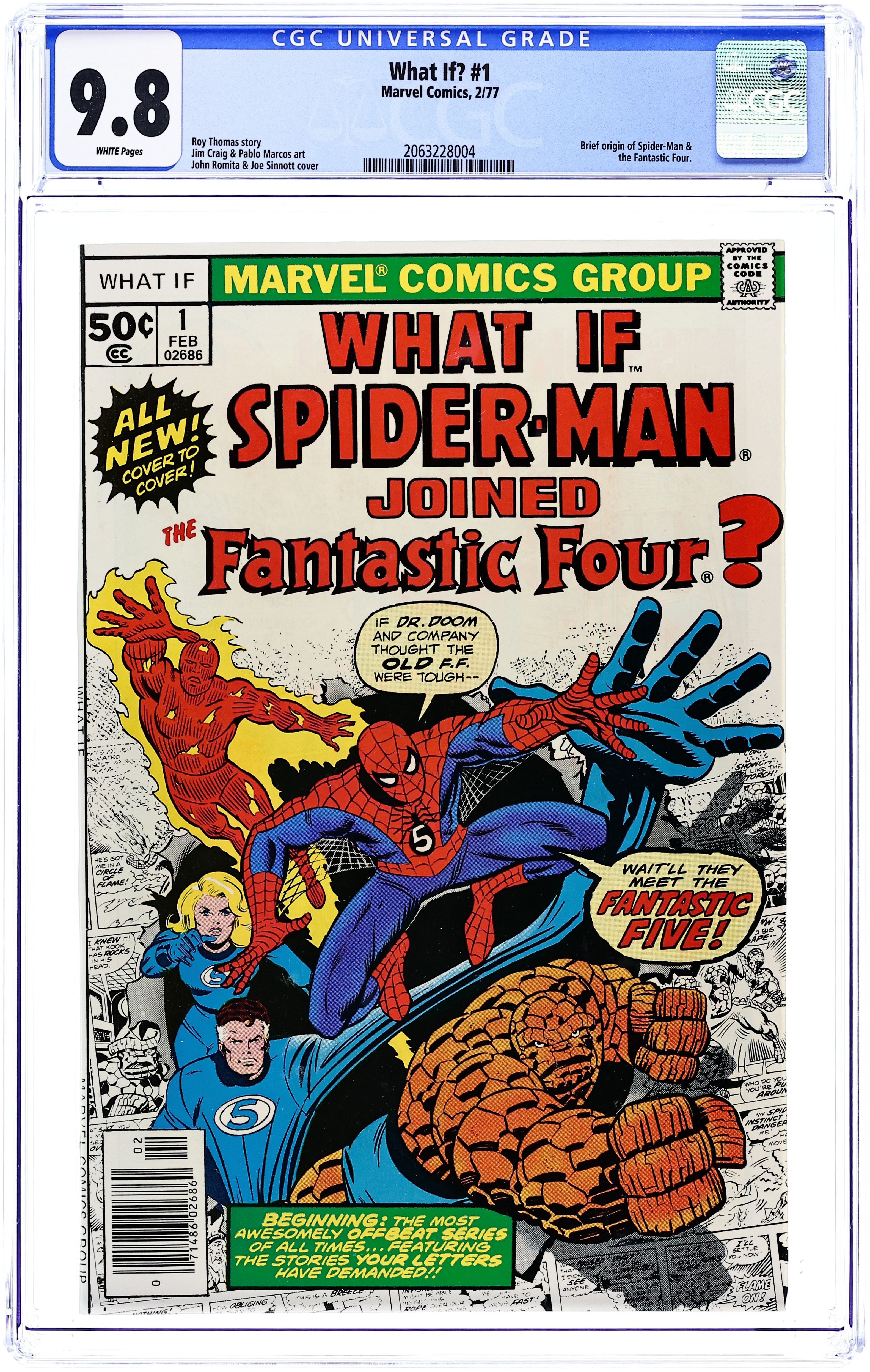 Starts Feb 9 Cover by Ron Wilson and Joe Sinnott. What if Spider-Man Joined the Fantastic Four? Script by Roy Thomas, pencils by Jim Craig, inks by Pablo Marcos; Spider-Man becomes a member of the FF; Cameos by Killraven, the Squadron Supreme, and Deathlok. Hostess Fruit Pie ad with the Hulk, pencils by Dave Cockrum. Ad for Richochet Racers with Spider-Man and Captain America. Roy Thomas discusses how the title came about. 52 pgs. Cover price $0.50.