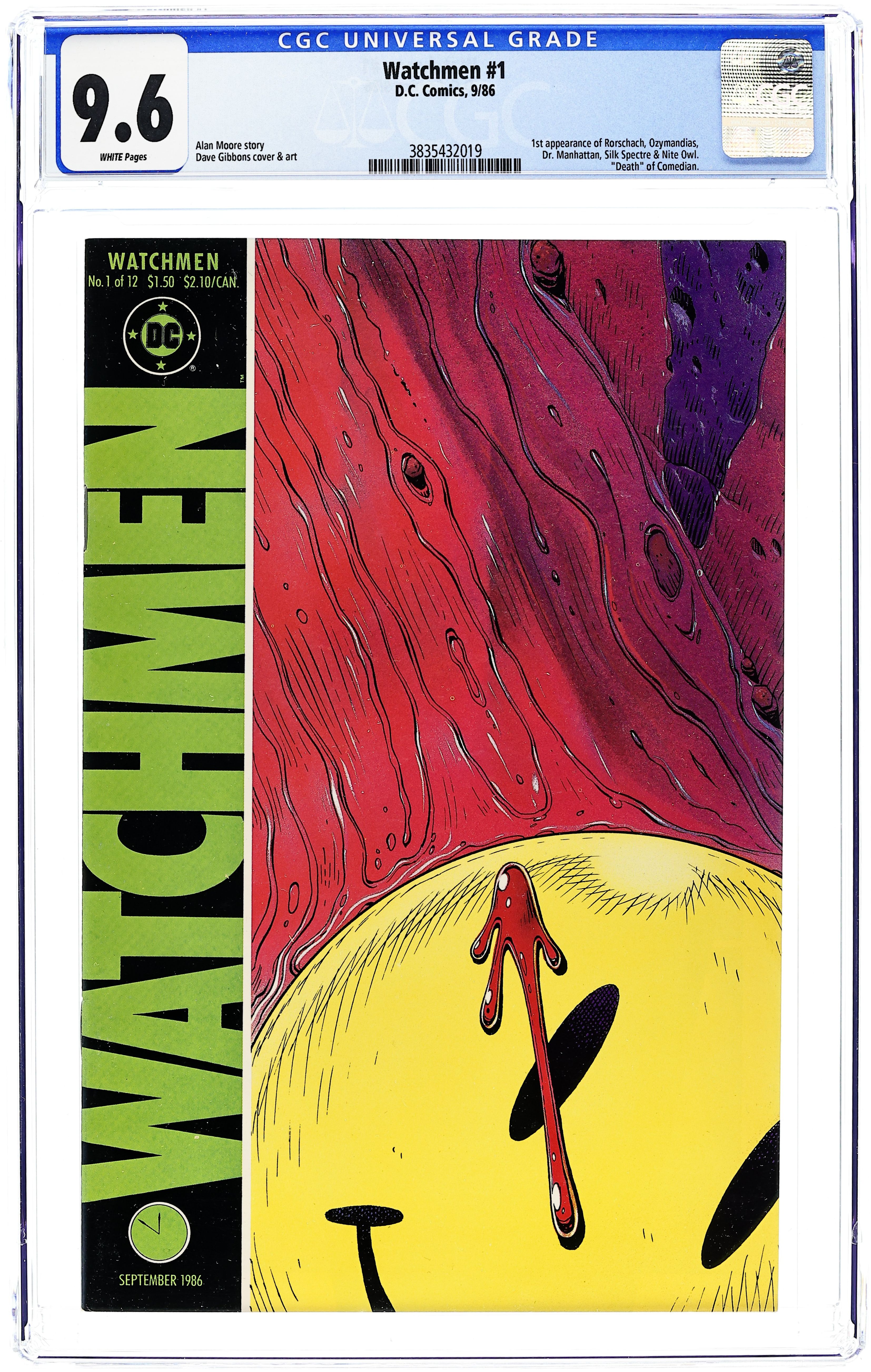 Alan Moore's classic take on the superhero genre. Widely considered to be one of the greatest stories in modern comics history. Art by Dave Gibbons. 1st appearance Rorschach, Ozymandias, Dr. Manhattan, Silk Spectre & Nite Owl. Death of the Comedian. Cover price $1.50.