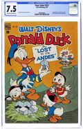 Indicia title is "Walt Disney's DONALD DUCK in "LOST IN THE ANDES", No. 223." Cover art by Carl Barks. Lost in the Andes, script and art by Carl Barks; Donald, a museum janitor, discovers that some "blocks" from Inca ruins are actually square eggs; When the other members of a scientific expedition fall ill, Donald and the nephews press on alone deep into the Andes; There they find a strange race of people who speak with Southern accents and live on the square eggs. Too Fit to Fit one-page story; Donald exercises so that he can fit into his tuxedo again. Tunnel Vision one-page strip; Donald ends the nephews' fighting over the television. Sleepy Sitters; Donald helps the nephews to baby-sit by singing a lullaby. Art by Carl Barks. 36 pages, full color. Cover price $0.10.
