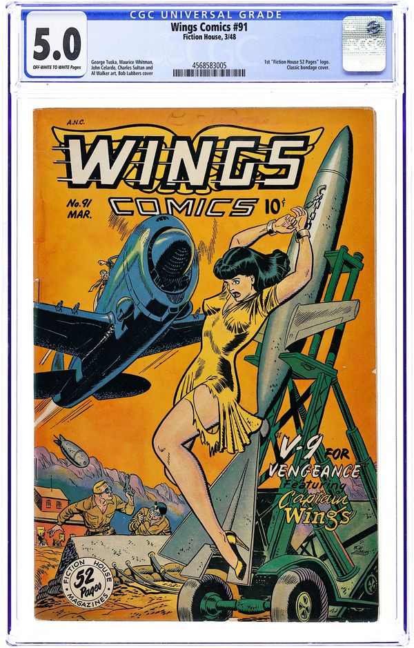 Cover by Bob Lubbers. Edited by J.F. Byrne and William R. Shelton. Stories and art by Bob Lubbers, Charles Sultan, Al Walker, George Evans, John Celardo and Maurice Whitman. Aviation-themed adventure, combat and history tales from pioneering comics publisher Fiction House. Working the advice column, reporter Jane Martin uncovers a blackmail plot and witnesses a murder; Greasemonkey Griffin, on yet another runaway plane, accidentally foils a jewel robbery; Suicide Smith transports tear gas to Central America and gets caught up in a revolution. Good-girl cover with bondage elements by Bob Lubbers. Captain Wings; Jane Martin; Greasemonkey Griffin; Air Heroes of World War II; Phantom Falcon; Suicide Smith; Ghost Squadron. 52 pages, Full Color. Cover price $0.10.