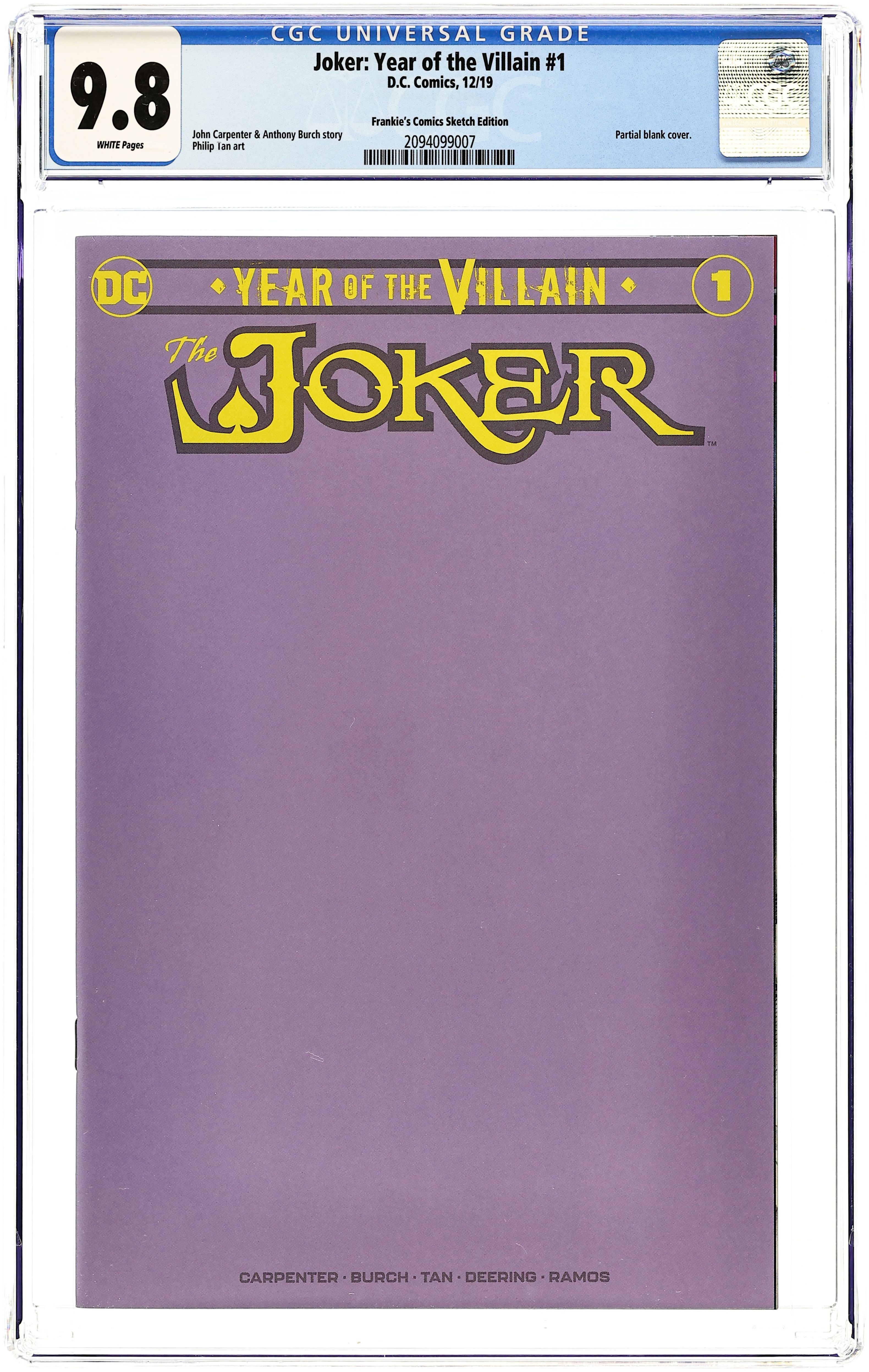 Frankie's Comics blank sketch variant. Written by John Carpenter and Anthony Burch. Art by Philip Tan and Marc Deering. In the Year of the Villain, what's a Clown Prince of Crime to do when the world has started to accept doing bad as the only way to live? Out-bad everyone else, of course! The Joker is on a mission to get his mojo back and prove to the world that there is no greater villainy than the kind that leaves you laughing. This special one-shot is co-written by legendary film auteur John Carpenter (The Thing, Halloween) and Anthony Burch (the Borderlands video games), making for a Joker comic that's twisted in ways you never imagined! 40 pages, full color. Rated T+