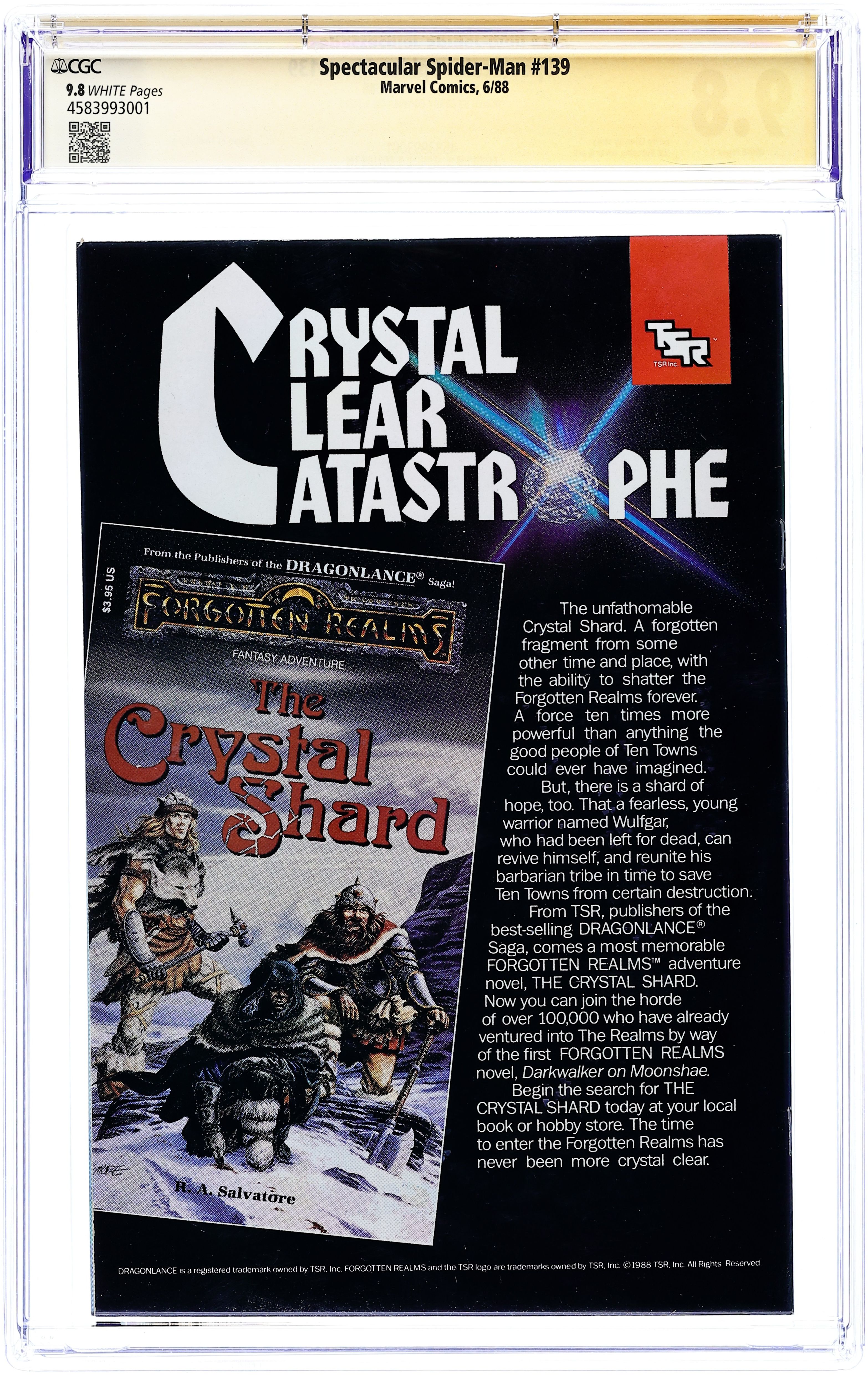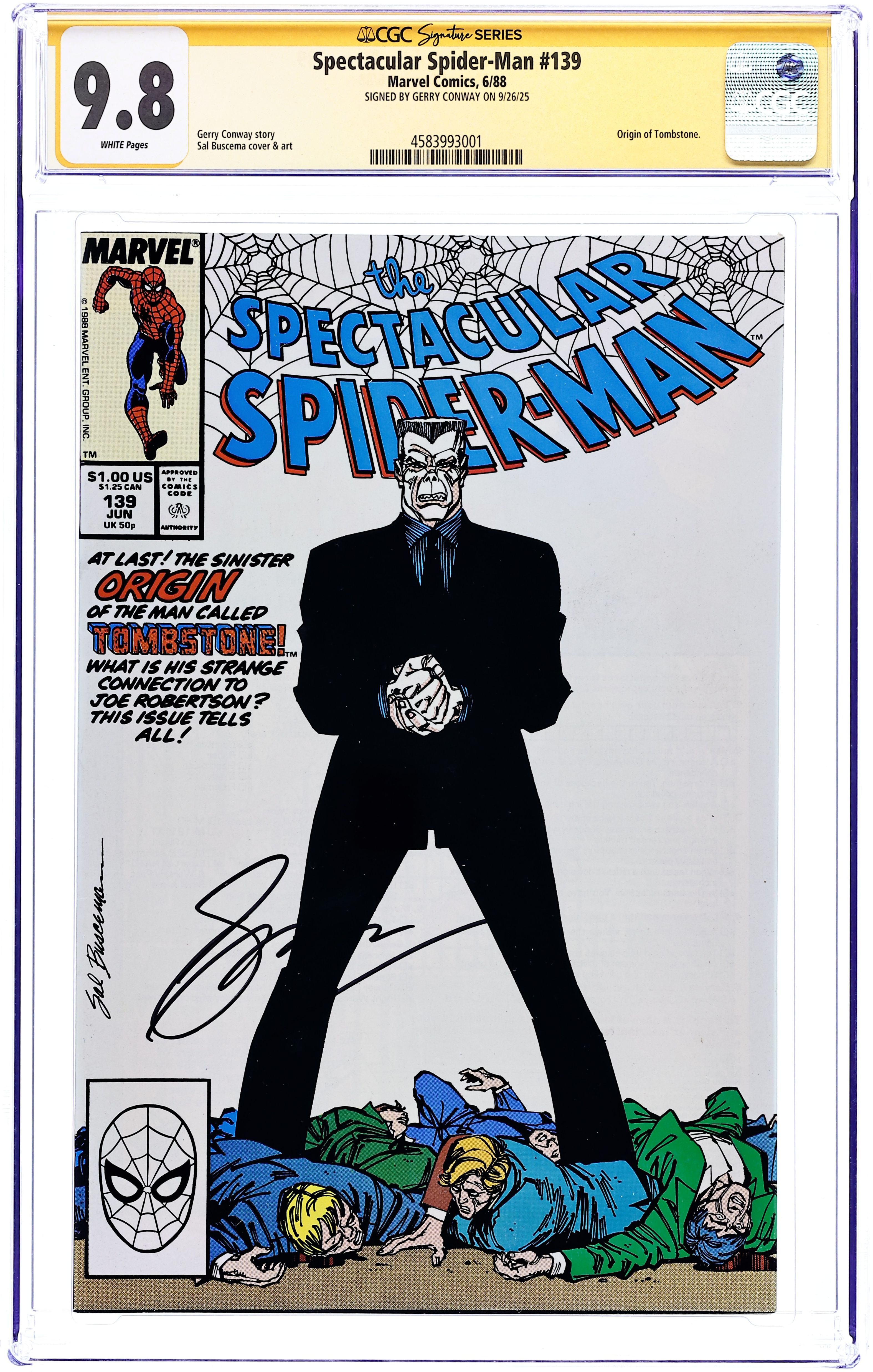 Direct Edition. "Best of Enemies!" Giant-Sized Anniversary Issue. Silver foil cover. Script by J.M. DeMatteis. Pencils and Inks by Sal Buscema. Cover by Sal Buscema. The Green Goblin is on the loose again! And the first thing he does is grab Mary Jane and take her to the top of the Brooklyn Bridge! Oh no! Is the tragic history from Amazing Spider-Man 121 going to repeat itself?! Thankfully not this time as Mary Jane talks sense into the goblin! But Harry's mental state continues to fluctuate between lucidity and lunacy. And his hatred for the web-slinger grows by the day! When will the goblin strike again? The untenable situation has Peter and Mary Jane living on the edge…waiting for the next attack! The fateful day of destiny finally arrives when Harry traps Spider-Man inside his townhouse wired with explosives! The goblin is poised to administer the coup de grâce when he suddenly realizes that little Normie and Mary Jane have just entered the building! And now the wall-crawler's long-time foe (and Peter Parker's long-time friend) faces a series of critical decisions! Save his son? Save Mary Jane? Save Spider-Man? What will the Green Goblin do with three lives on the line? Will years of friendship or years of frustration guide Harry's choices? A heartbreaking ending. Death of Harry Osborn. An unknown percentage of the print run was produced with the foil design misaligned. We do not differentiate between the two, but any slabbed copies listed here with misaligned foil noted on the label will have that notation in our listings as well. 48 pages. Cover price $2.95.