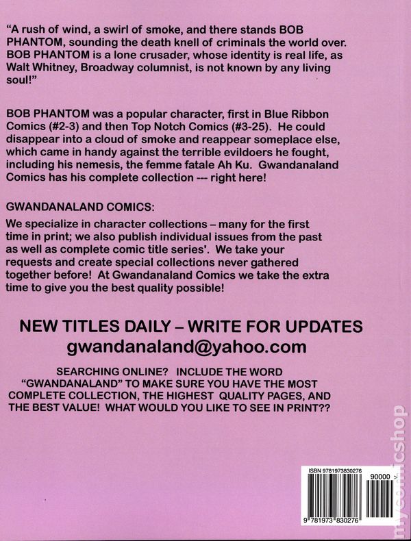 Volume 1237 - 1st Printing. "The Complete Bob Phantom!" Collects Blue Ribbon Comics (1949 St. John) #2-3, and Top-Notch Comics (1939) #3-25. These budget friendly reprints of classic western sci-fi, horror, and adventure comics feature some of the best in public domain comic book reprints. Softcover, 8 1/2-in. x 11-in., 304 pages, Full Color.