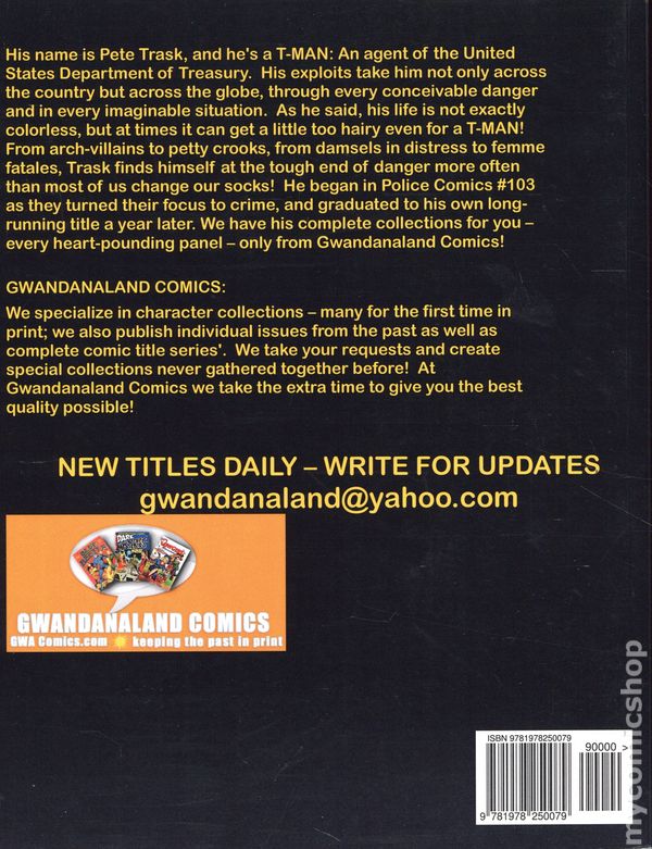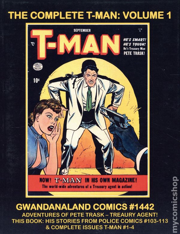 Volume 1442 - 1st Printing. "The Complete T-Man Volume 1!" Collects 103-113, and T-Man (1951) #1-4. These budget friendly reprints of classic western sci-fi, horror, and adventure comics feature some of the best in public domain comic book reprints. Softcover, 8 1/2-in. x 11-in., 264 pages, full color.