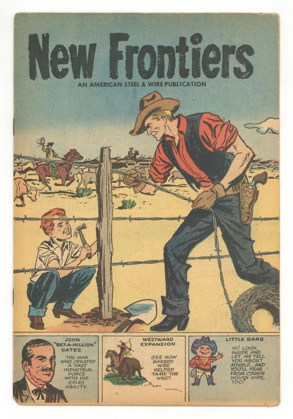 New Frontiers (1958) is a promotional comic book published by Harvey Information Press (United States Steel Corp.). In this issue the diminutive cowboy Little Barb tells the story of the history of barbed wire. 16 pages, full color, 7-in. x 10.25-in., newsprint, with no cover price.