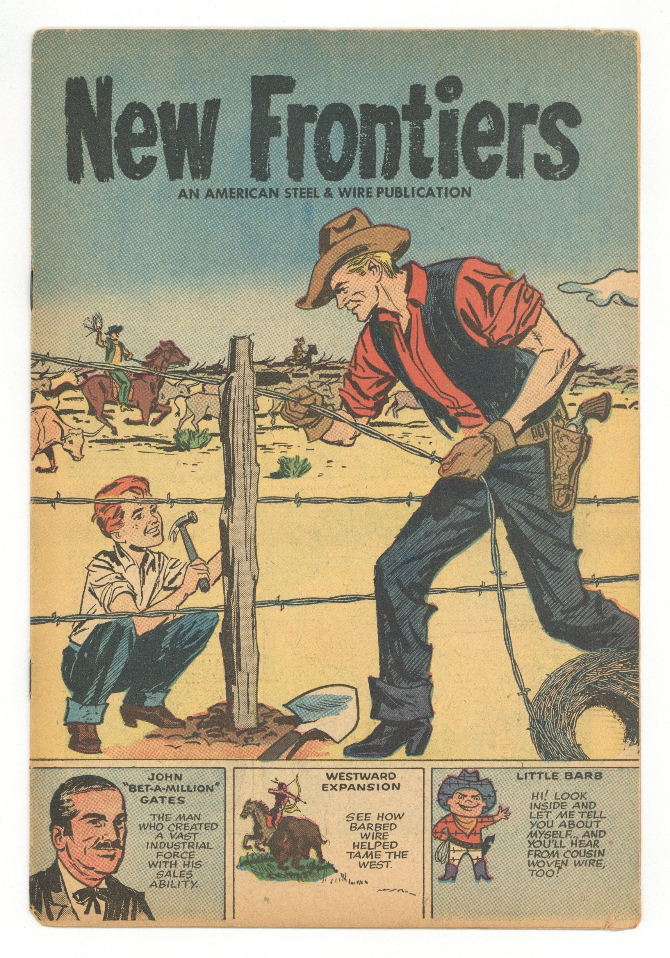 Published 1958 by U.S. Steel Corp..$18.25New Frontiers (1958) is a promotional comic book published by Harvey Information Press (United States Steel Corp.). In this issue the diminutive cowboy Little Barb tells the story of the history of barbed wire. 16 pages, full color, 7-in. x 10.25-in., newsprint, with no cover price.