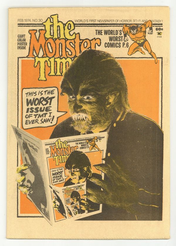 Published Feb 1974 by Monster Times Publishing.$19.25The World's First Newspaper of Horror, Sci-Fi and Fantasy! This issue: The World's Worst Comics! This is the worst issue of TMT ever, Werewolf tongue firmly in cheek! Plus - Giant Color Poster Inside. The Monster Times (1972) is a fanzine published by Monster Times Publishing Co. 32 pages, color cover with black and white photos and illustrations, 12-in x 14-in. Cover price $0.60.