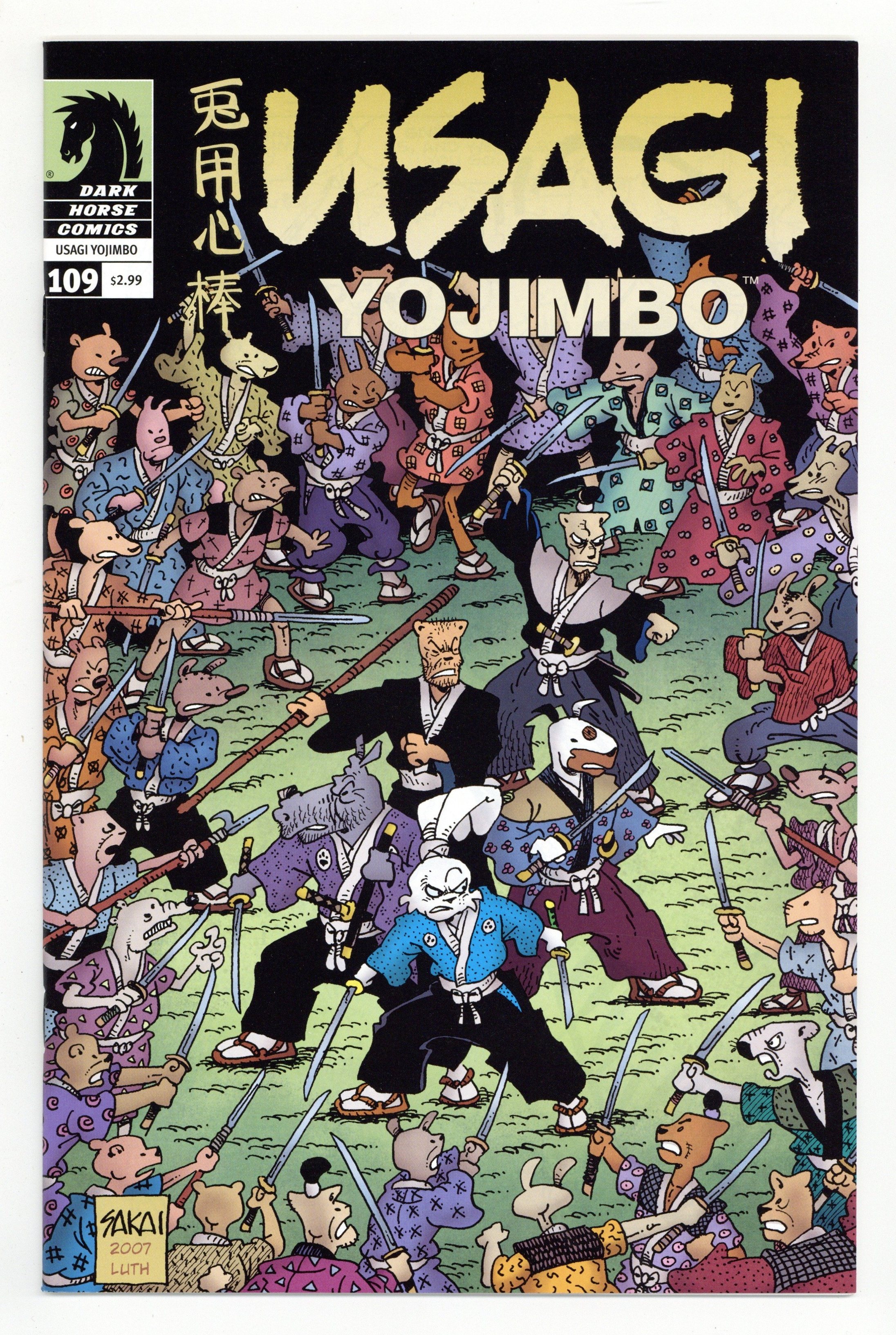 Published Jan 2008 by Dark Horse.$12.00STAN SAKAI (W/A) On sale Jan 30 The gripping 'Sparrows' saga comes to its surprising conclusion as Usagi, Gen, Stray Dog, and Sanshobo find themselves trapped in a small temple surrounded by bounty hunters! These hunters are after one thing-Boss Bakuchi's reward for his son's killer: Inazuma. Yet Usagi and his companions cannot turn the swordswoman over to the mob while she is still possessed by Jei the Black Soul. Sanshobo must exorcise the demon, but where will it go when it leaves Inazuma? And what does the mysterious samurai Isamu have to do with all this? Find out Isamu's true identity and the fate of Inazuma, this month in Usagi Yojimbo! 2007 Harvey Award winner! Cover price $2.99.