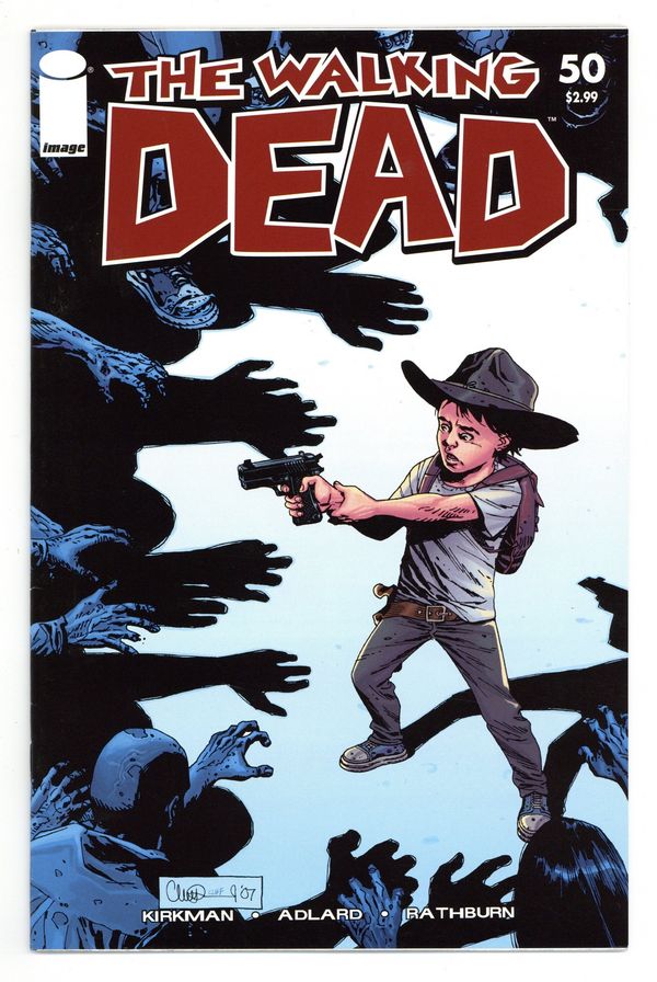 Cover by CHARLIE ADLARD. All alone now. For this landmark 50th issue we present a special stand-alone tale that will both warm your heart and chill you to the bone. THE WALKING DEAD #50 story ROBERT KIRKMAN art CHARLIE ADLARD & CLIFF RATHBURN. ? 32 PAGES ? BW ? Cover price $2.99.