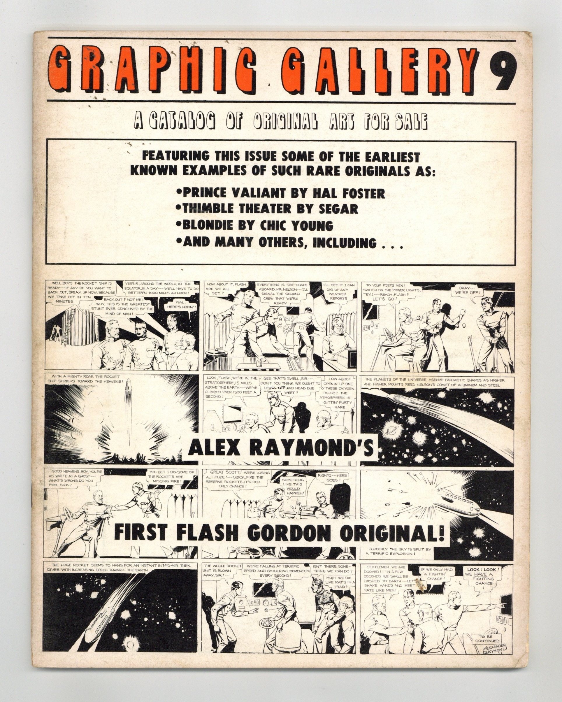 Published 1976 (est.) by Russ Cochran.$23.00Published by Russ Cochran, Graphic Gallery was a fully illustrated catalog of fine original artwork, all of it for sale. Issue #9 includes work by Hal Foster, E. C. Segar, Alex Raymond, Cliff Sterrett, Chic Young, Will Gould, Jesse Marsh, Milton Caniff, Russell Myers, Frank Frazetta, Berni Wrightson, Richard Corben, and others. 66 pgs. Cover art by Raymond. 1976.