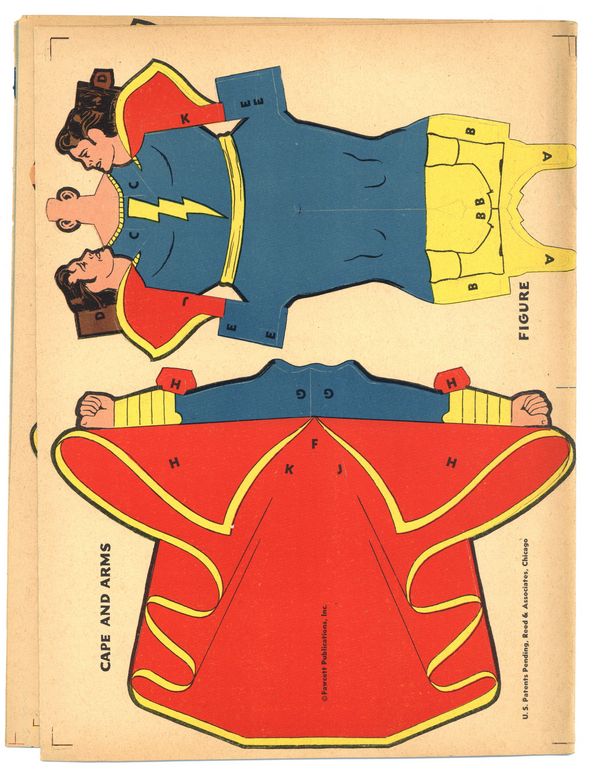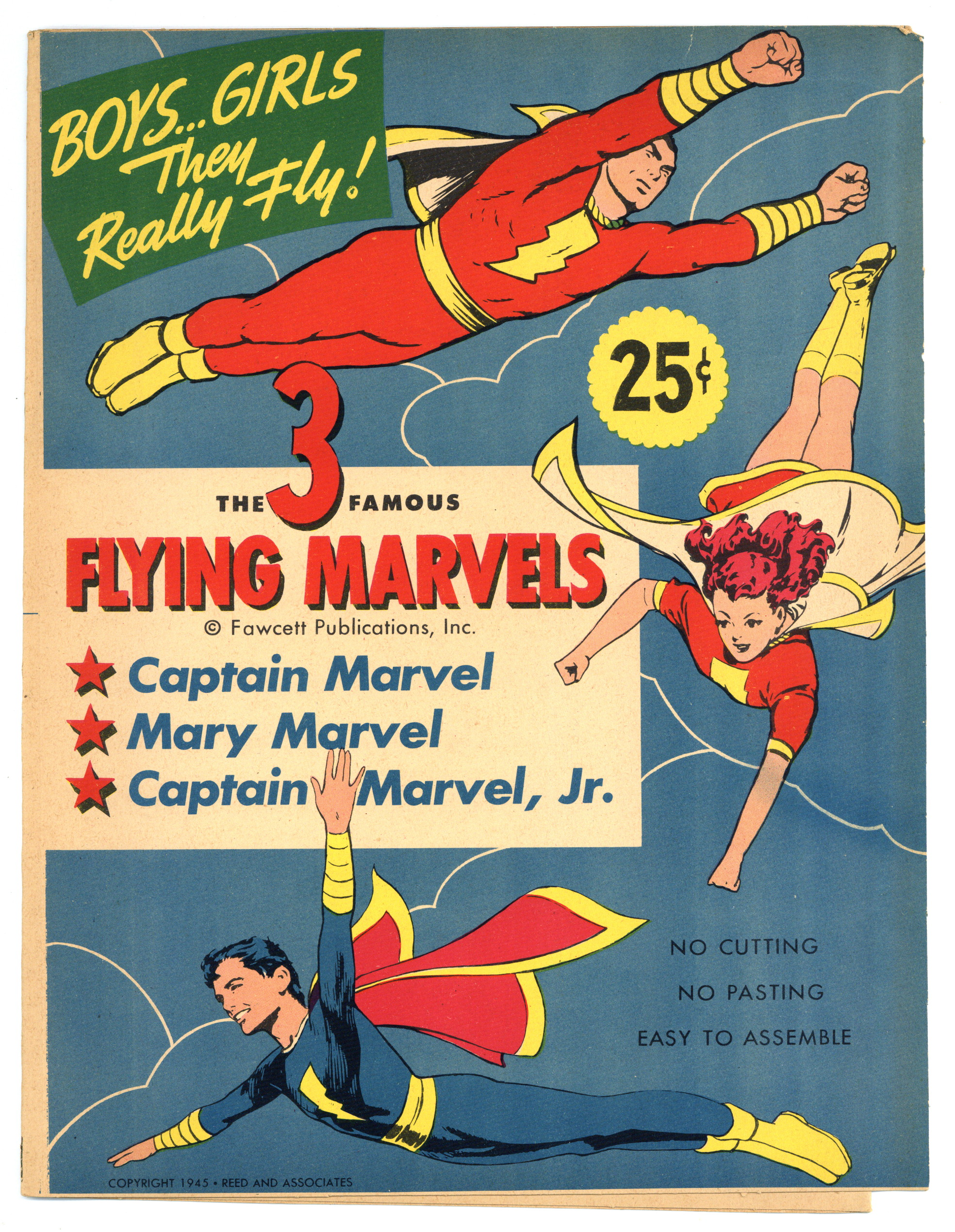 $18.00Captain Marvel Flying Marvels (1945), Fawcett Publications. Build the Marvel family with no cutting or pasting. Four panel "tri-fold" cardstock sheet with each of the three Marvel Family members. Also contains instructions on how to build and fly each figure. 8 pages, full color, 9-in x 12-in. Cover price $0.25.