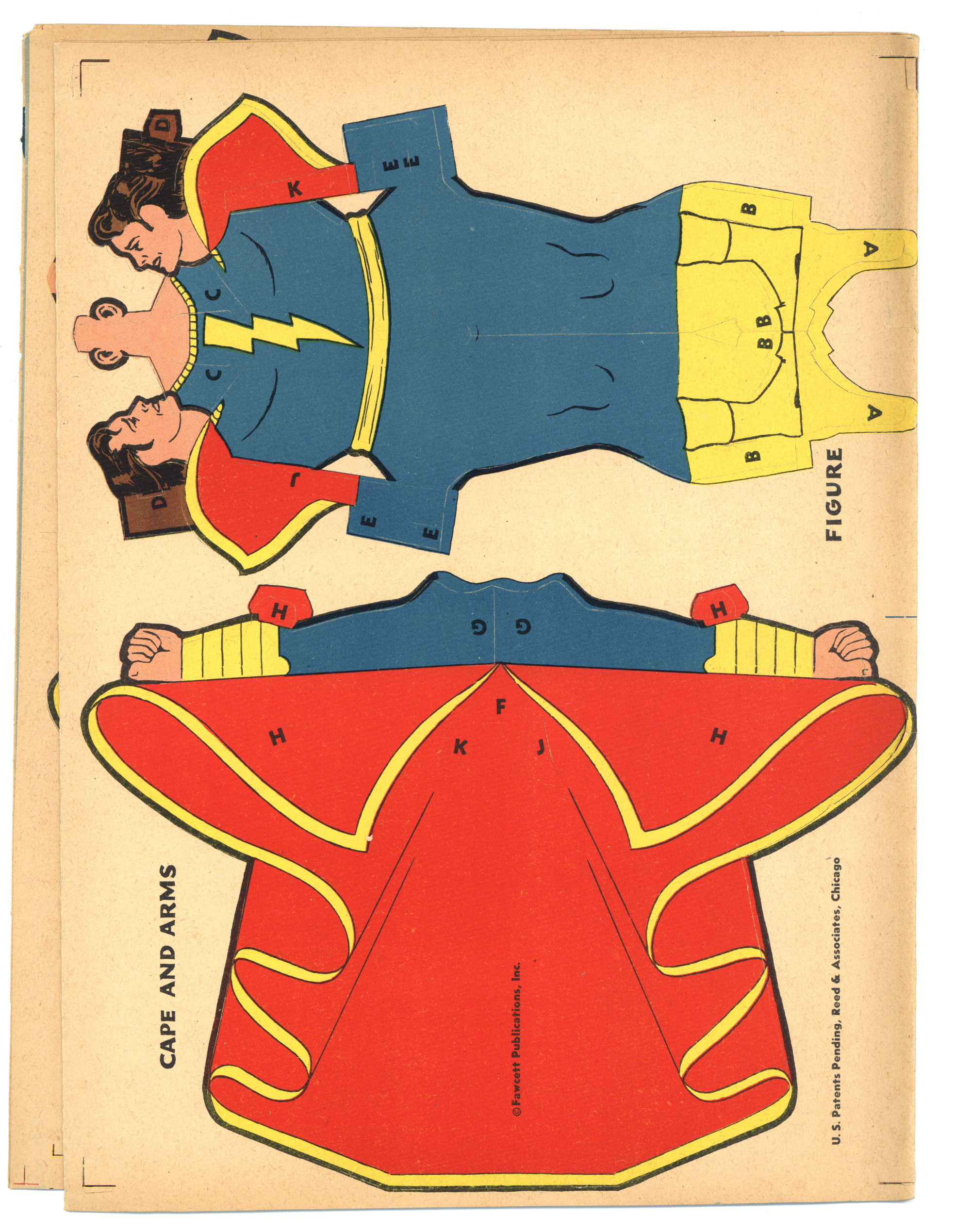 $57.00Captain Marvel Flying Marvels (1945), Fawcett Publications. Build the Marvel family with no cutting or pasting. Four panel "tri-fold" cardstock sheet with each of the three Marvel Family members. Also contains instructions on how to build and fly each figure. 8 pages, full color, 9-in x 12-in. Cover price $0.25.