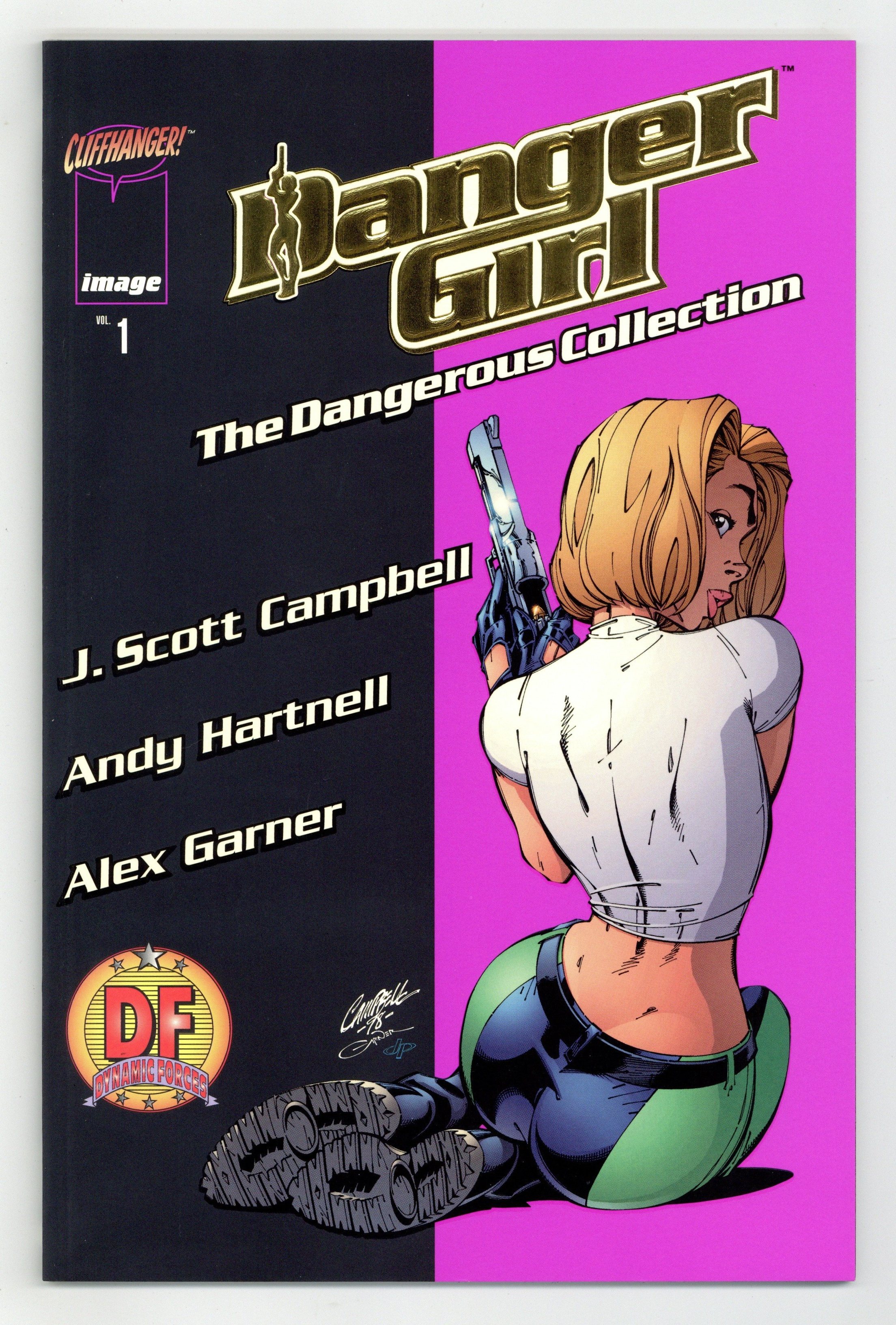 DF Gold Foil Edition - Volume 1 - 1st printing. Written by J. Scott Campbell and Andy Hartnell. Art by J. Scott Campbell and Alex Gardner. Includes Danger Girl (1998-2001) #1, the 8-page preview story, digitally remastered art and color, Commentary by J. Scott Campbell and Andy Hartnell, sketches and concept material, a cover gallery, and promotional extras. 54 pages, full color. NOTE: Limited to 6,000 copies. Includes Dynamic Forces Certificate of Authenticity. Cover price $5.95.
