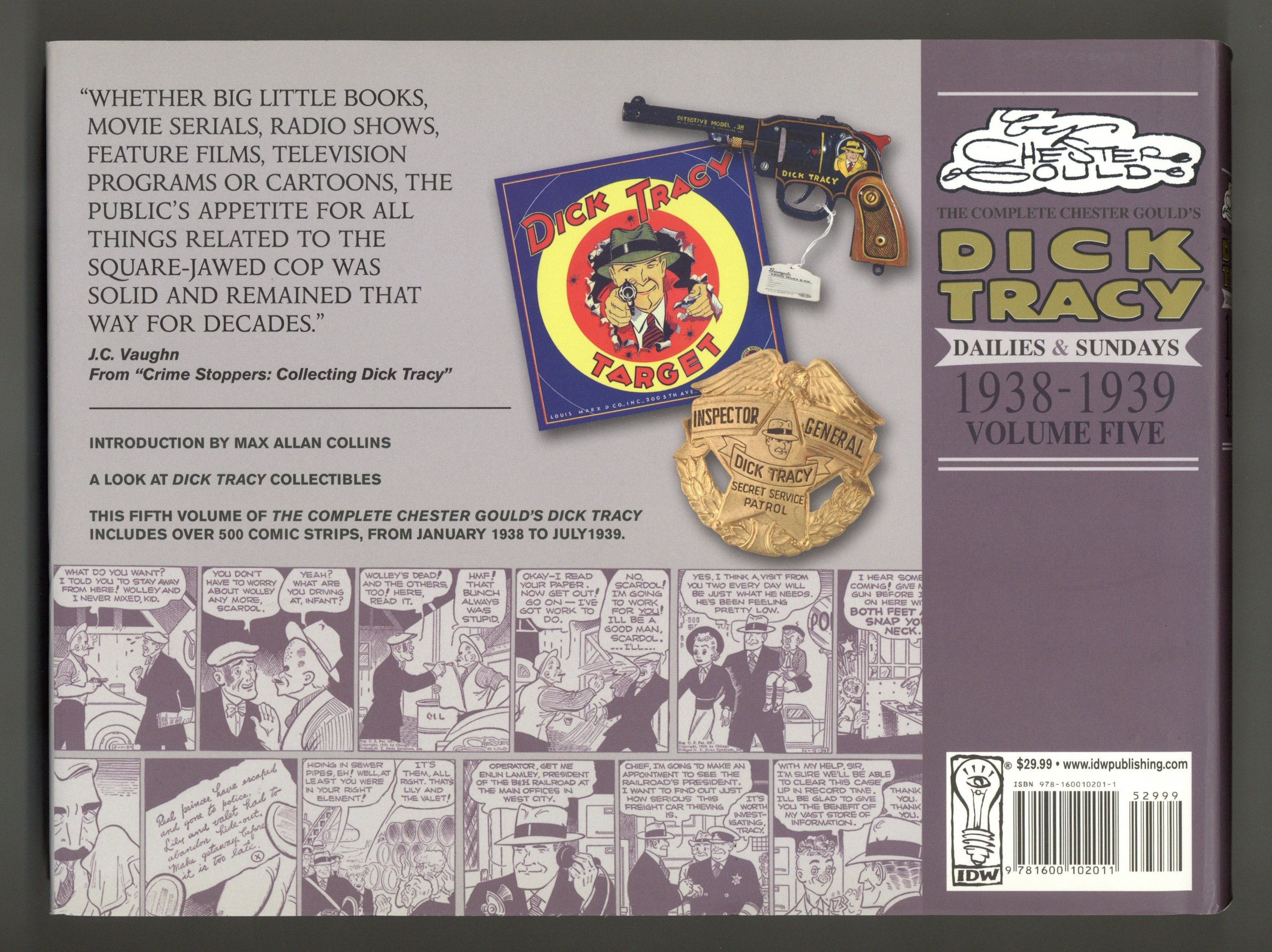 Volume Five once again contains over 500 comic strips from the series' early years, this time covering material that originally ran from January 1938 through July 1939. Included in this collection are Tracy story arcs such as "Chief Shellberry," Karpse," "Scardol," and "Whip Chute," introducing such villains as "Nails," Jojo Nidle, and Johnny Ramm.