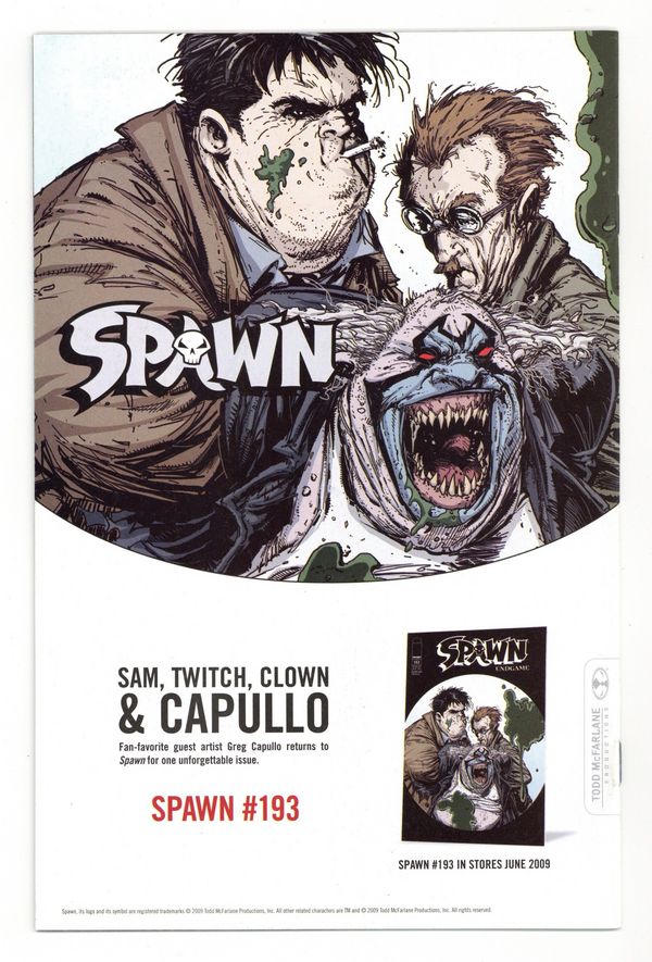 $30.50Endgame: Part 8 - Written by TODD McFARLANE. Art and Cover by WHILCE PORTACIO and TODD McFARLANE. Realizing that there is no one he can fully trust, Jim sets out on his own, growing increasingly paranoid and desperate for answers regarding his identity. As he becomes more and more reliant on the Spawn entity to sustain him, enemies begin closing in from all sides. Meanwhile, detectives Sam and Twitch make a surprising discovery. 32 pages, full color. Cover price $2.95.