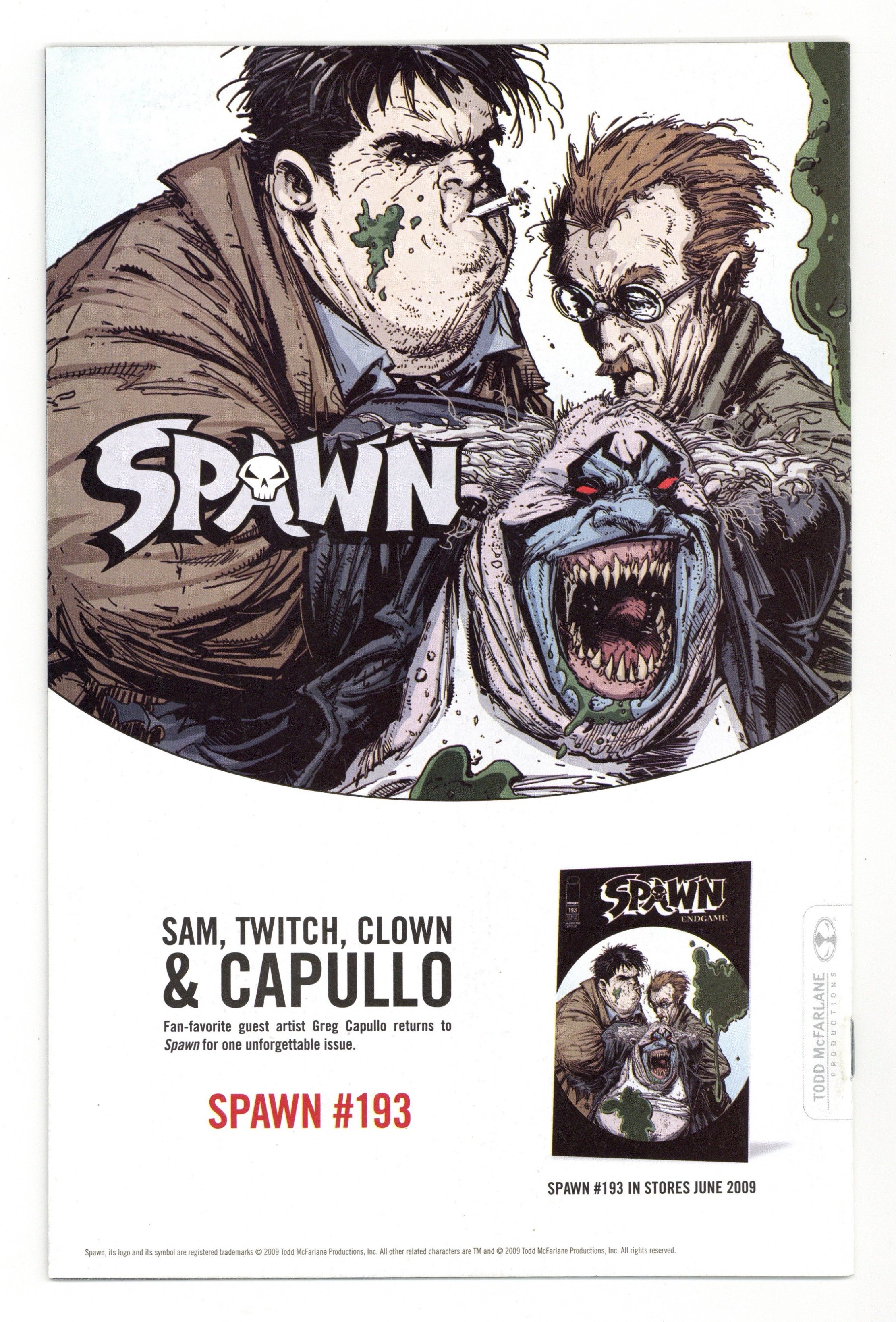 Endgame: Part 8 - Written by TODD McFARLANE. Art and Cover by WHILCE PORTACIO and TODD McFARLANE. Realizing that there is no one he can fully trust, Jim sets out on his own, growing increasingly paranoid and desperate for answers regarding his identity. As he becomes more and more reliant on the Spawn entity to sustain him, enemies begin closing in from all sides. Meanwhile, detectives Sam and Twitch make a surprising discovery. 32 pages, full color. Cover price $2.95.