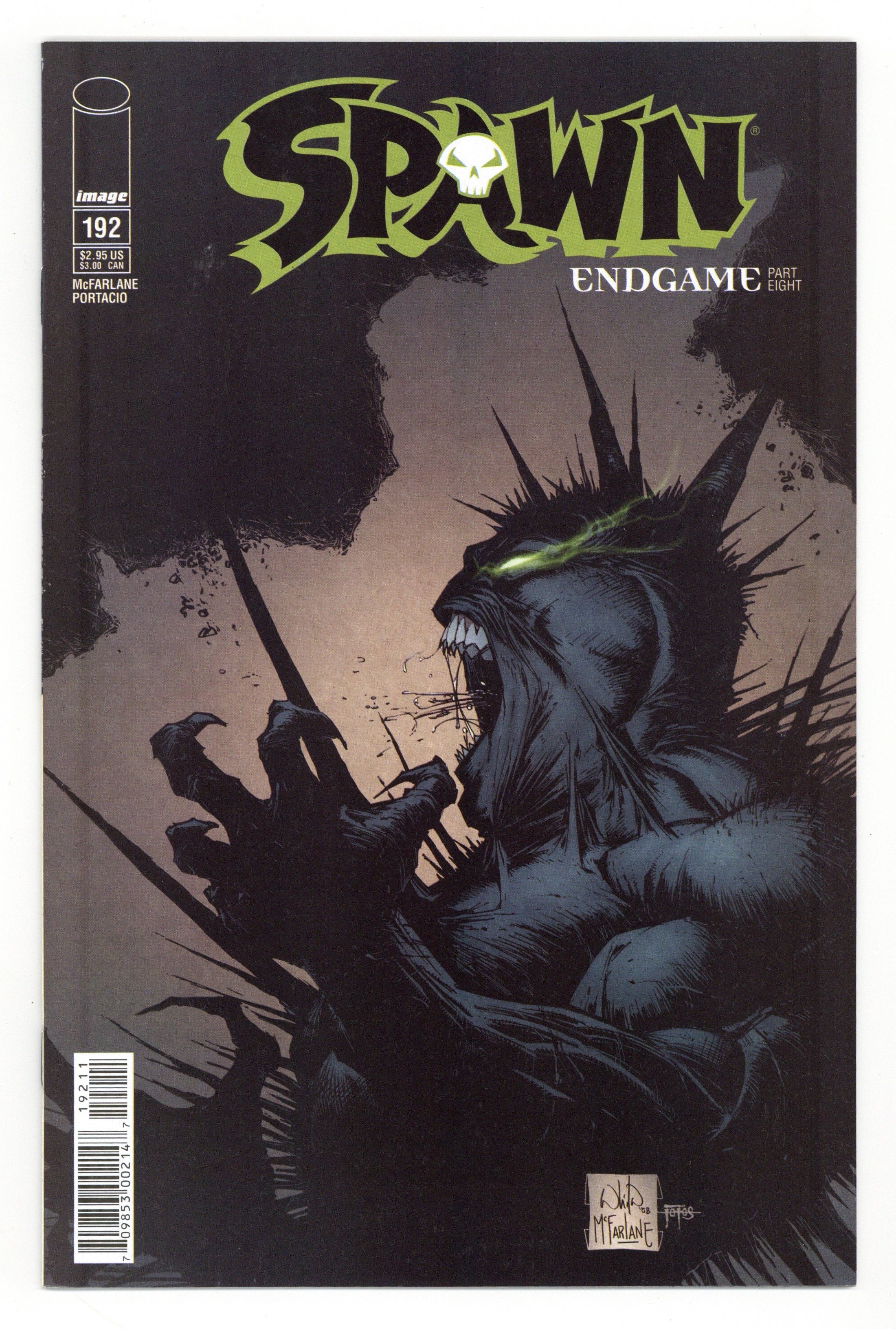 $25.00Endgame: Part 8 - Written by TODD McFARLANE. Art and Cover by WHILCE PORTACIO and TODD McFARLANE. Realizing that there is no one he can fully trust, Jim sets out on his own, growing increasingly paranoid and desperate for answers regarding his identity. As he becomes more and more reliant on the Spawn entity to sustain him, enemies begin closing in from all sides. Meanwhile, detectives Sam and Twitch make a surprising discovery. 32 pages, full color. Cover price $2.95.