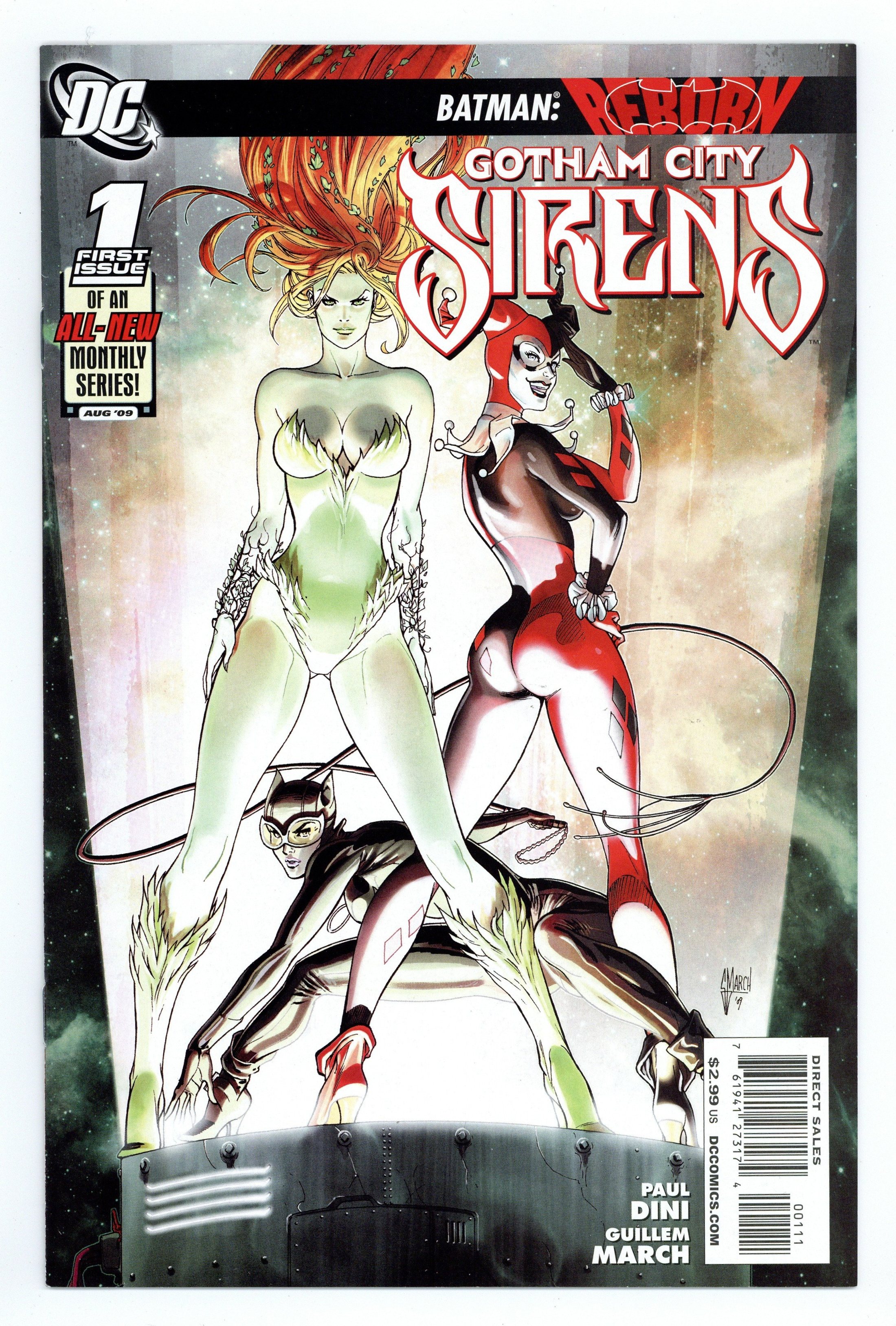 Cover by Guillem March. Written by Paul Dini Art by Guillem March. This all-new series features the bad girls of Gotham City! Catwoman, Poison Ivy and Harley Quinn are tired of playing by other people's rules regardless of which side of the law they're on. These tough ladies have a new agenda that's all their own, and they'll use any means necessary to pursue it. But can they get along and work as a team? And who will get hurt along the way? Cover price $2.99.