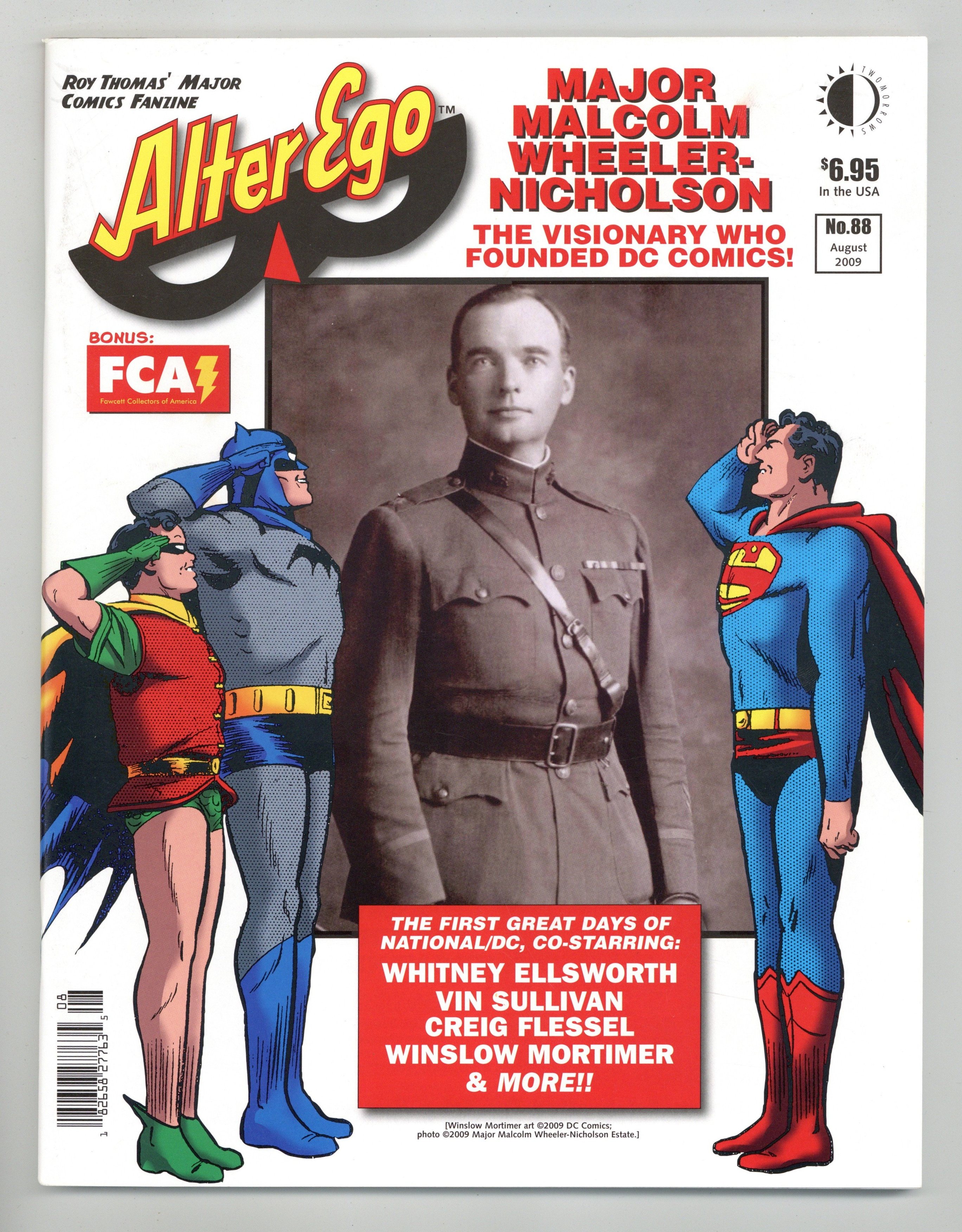 Published Aug 2009 by TwoMorrows.$8.50Behind a cover by Win Mortimer, Alter Ego presents the first-ever, in-depth look at National/DC's legendary founder, Major Malcolm Wheeler-Nicholson, and early editors Whitney Ellsworth, Win Sullivan, and Mort Weisinger with rare art and artifacts by Siegel & Shuster, Bob Kane, Gardner Fox, Sheldon Moldoff and more. Cover price $6.95.