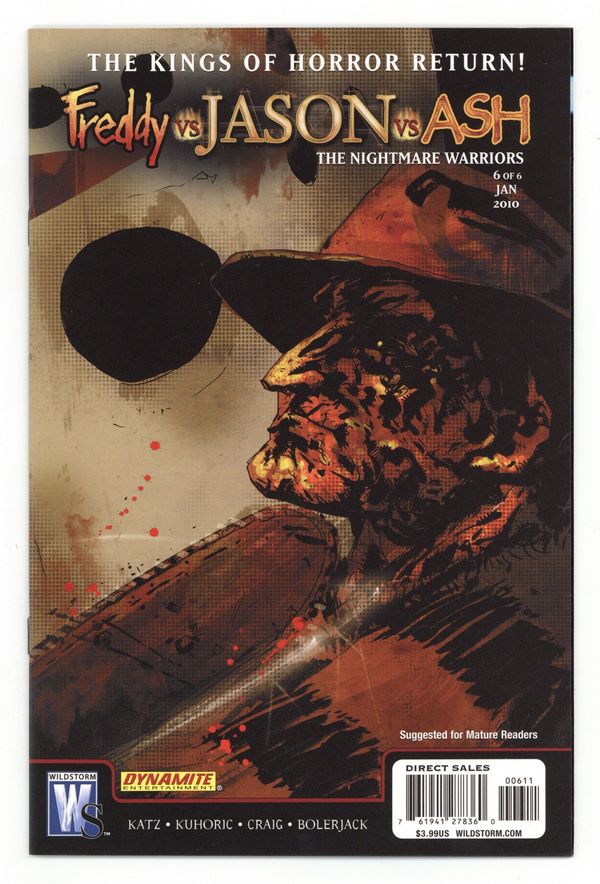 Published Jan 2010 by DC/Wildstorm.$21.00Written by Jeff Katz and James Kuhoric. Art by Jason Craig. Cover by Jock. As the bloody end nears, Ash must lead his remaining forces against the amassed titans of terror. Washington has been leveled, and the odds are stacked against the motley crew of survivors. The vicious battles that end this series are legendary - Tommy Jarvis vs. Jason Voorhees, Ash Williams vs. Freddy Krueger, and even the army of the dead against the ghosts of victims past! 32 pages, full color. MATURE READERS. Cover price $3.99.
