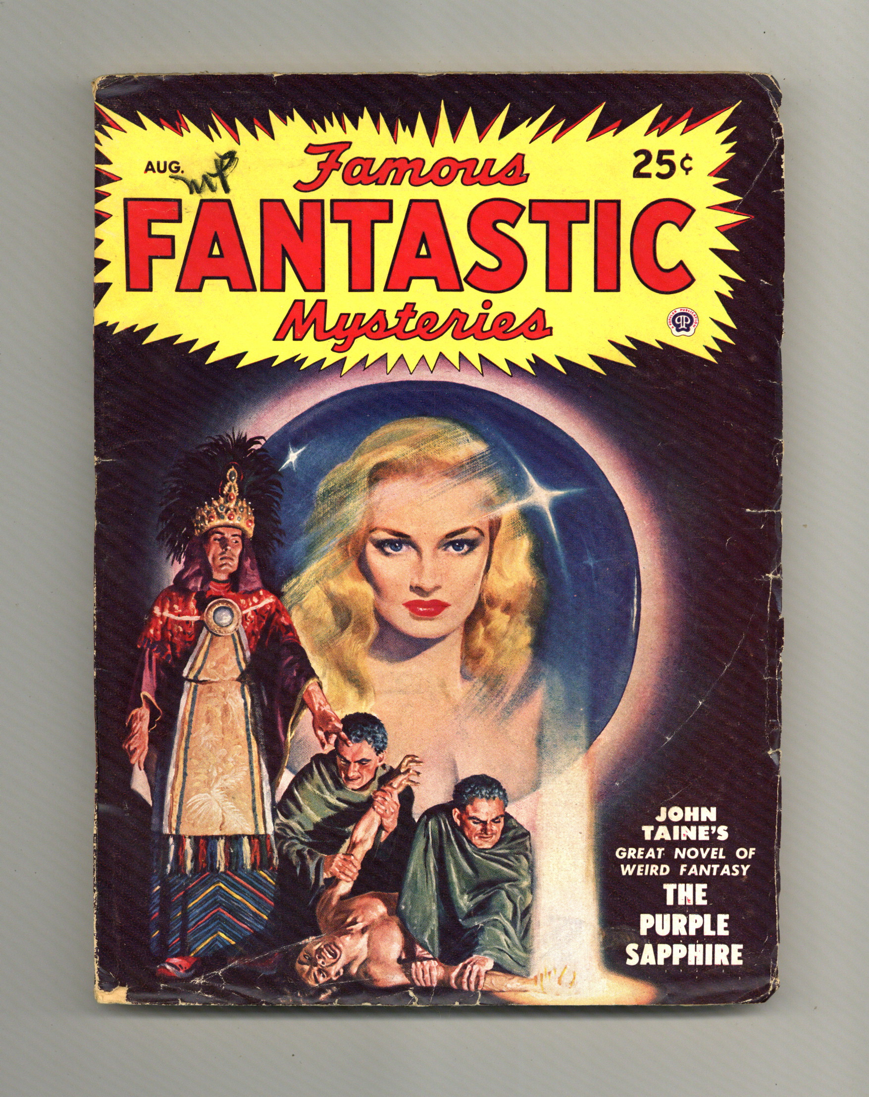 Aug 1948. Cover by Lawrence. "The Purple Sapphire" by John Taine and "The Night Before the End of the World" by Murray Leinster. Interior illustrations by Virgil Finlay and Leydanfrost. 7-in. x 9 1/2-in.; black and white; 128 newsprint pages. Published by Popular Publications Cover price $0.25.